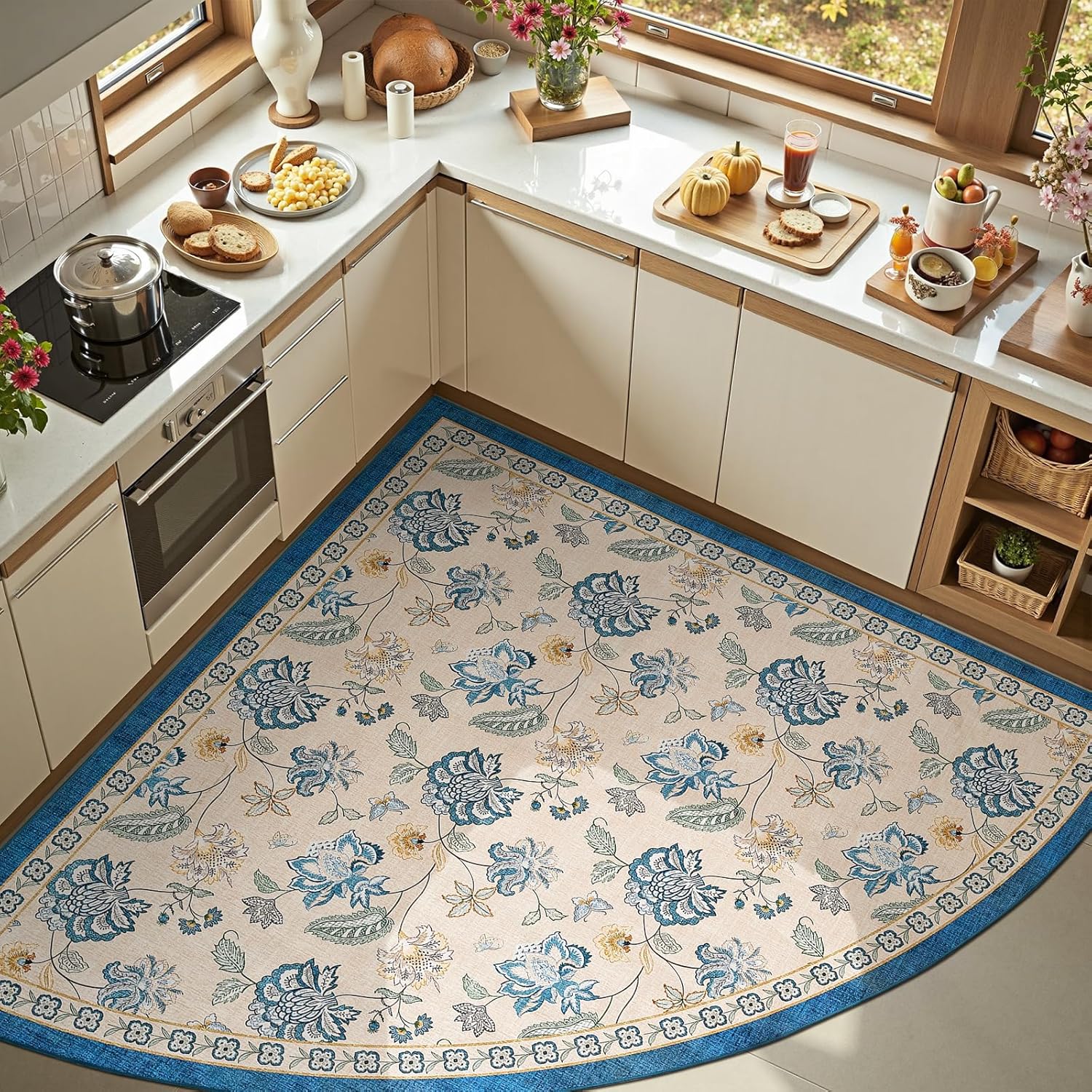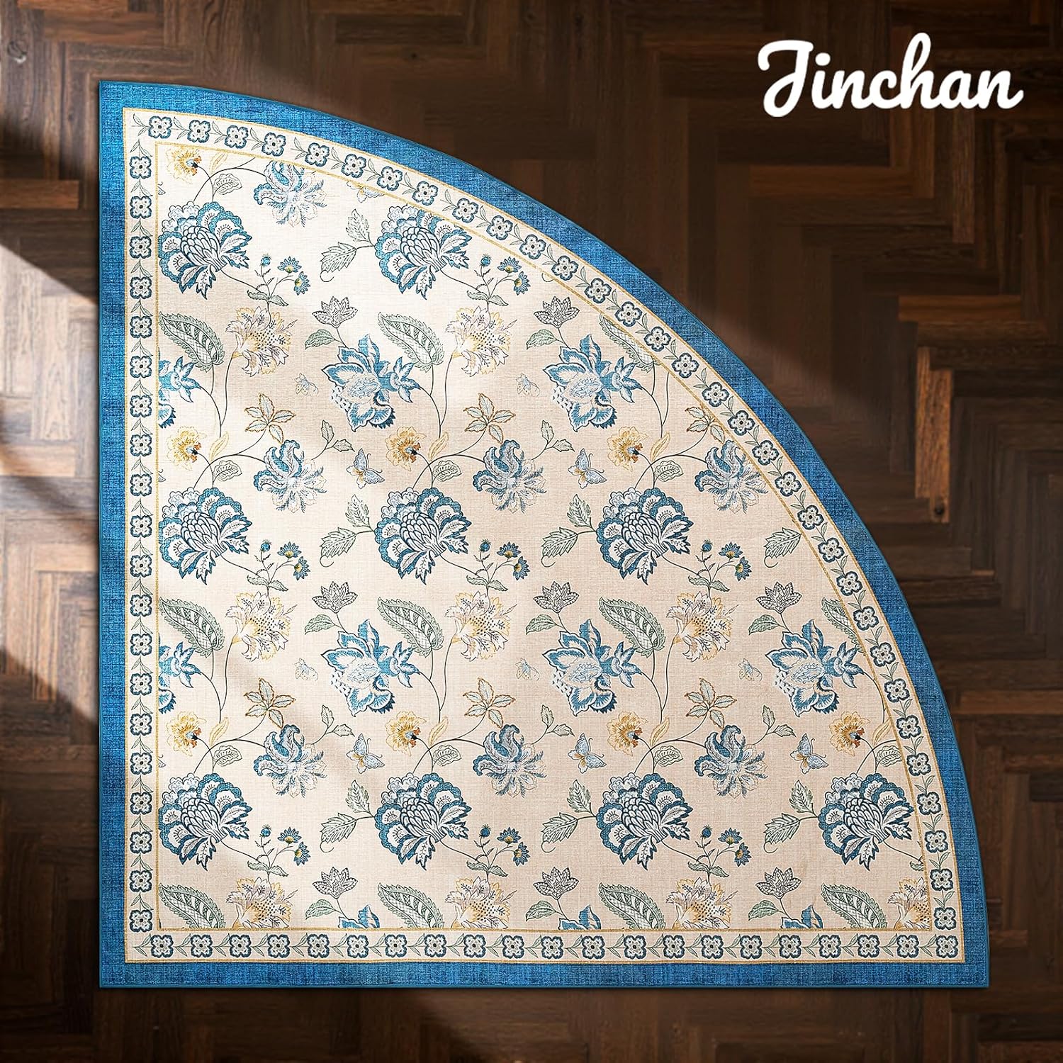 jinchan Floral Corner Rug for Kitchen Washable Nursery Rug Vintage Romance Design Non Slip Quarter Circle Lightweight Low-Pile Throw Carpet for Playroom Reading Nook Office, 5ft Radius, Blue/Beige