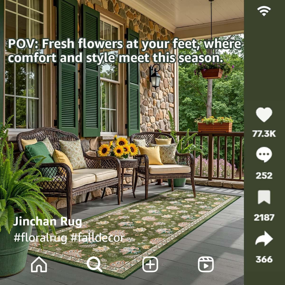 jinchan 3x10 Floral Runner Rug for Hallway Washable Kitchen Runner Vintage Romance Design Non Slip Thin Indoor Floor Cover Low-Profile Throw Carpet for Entryway Bathroom Bedroom Porch, Green