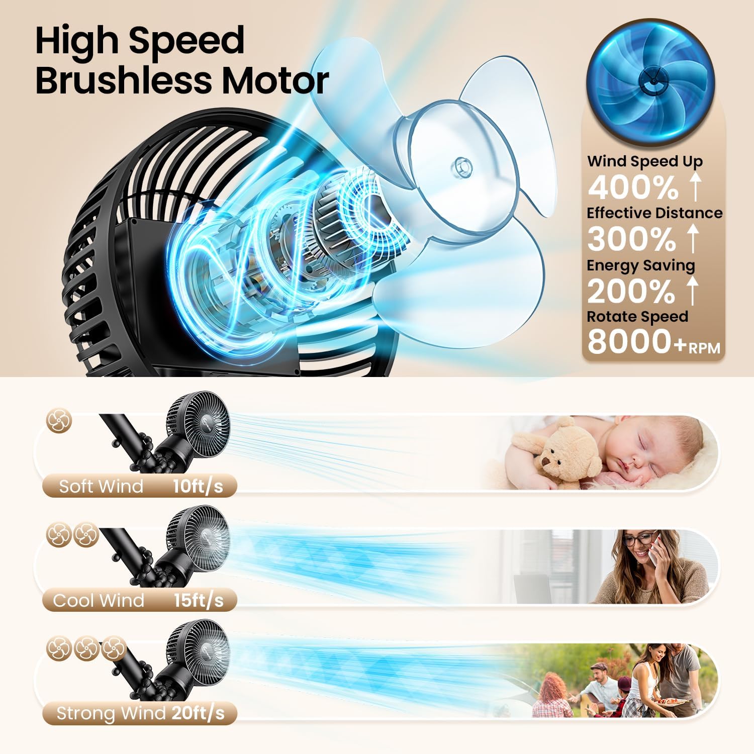 - ă3-Speed Cooling with Long RuntimeăThis rechargeable stroller fan delivers 3 quiet speeds - gentle for infants, medium for indoor use, and strong for outdoors. The upgraded motor ensures quiet operation and extended runtime, keeping you comfortably cool all night even on the highest speed setting.