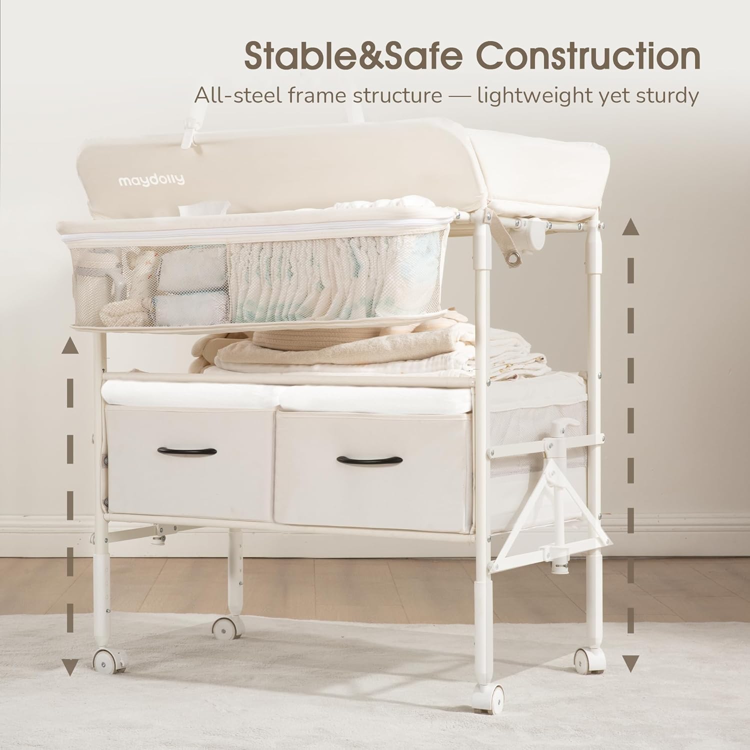 Baby Changing Table with Wheels, Maydolly Portable Foldable Changing Table, Waterproof Diaper Changing Station, Adjustable Height Changing Station, Mobile Nursery for Newborn and Infant (Beige)