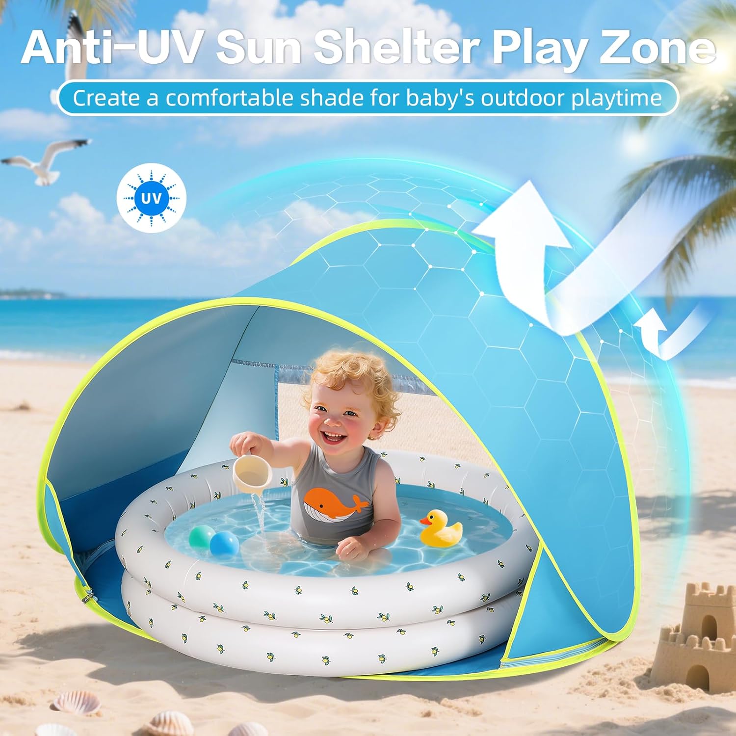 Baby Beach Tent Canopy: with Inflatable Kiddie Swimming Pool Toys - UPF50+ UV Protection Pop Up Sun Shelter Tent & Small Pool - Beach Essentials for Infant Toddlers