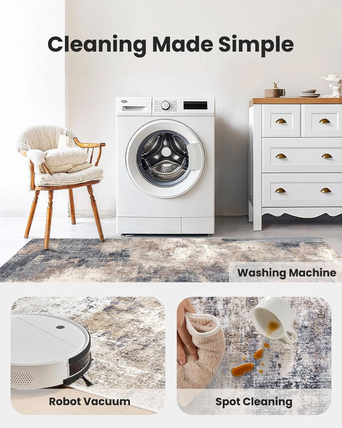 - 【Durable and Easy to Clean】This living room rug features a 0.24″ low-pile design with double-stitched edges for durability and easy maintenance. It’s easy to clean with a standard vacuum or robotic vacuum. For a deeper clean, this rug is machine washable. Ideal for high-traffic areas.