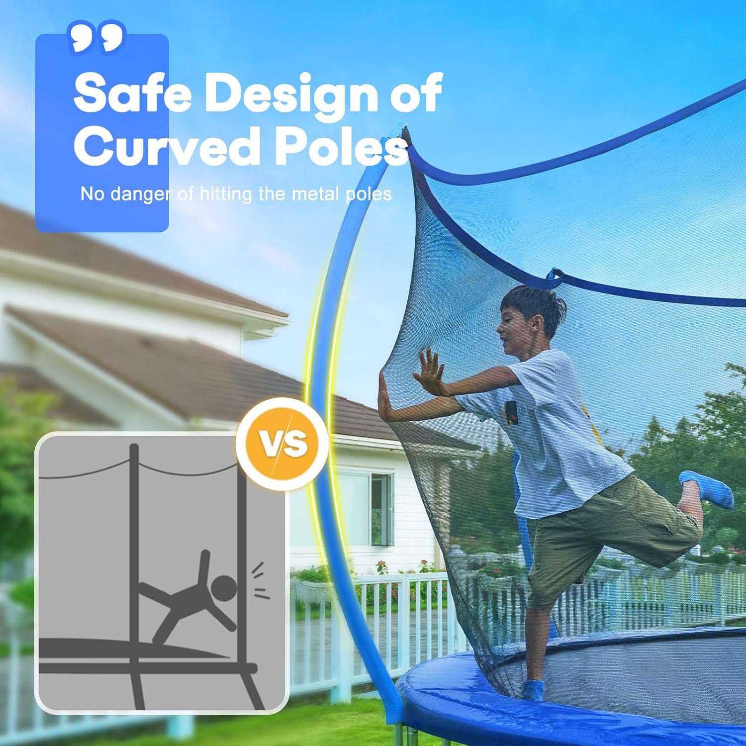 - 【Curved Net Poles】The outwardly curved net poles, positioned far away from the enclosure net, eliminate the risk of collision with hard poles. This ensures a worry-free jumping experience for little jumpers, allowing them to jump to their heart's content while prioritizing safety.