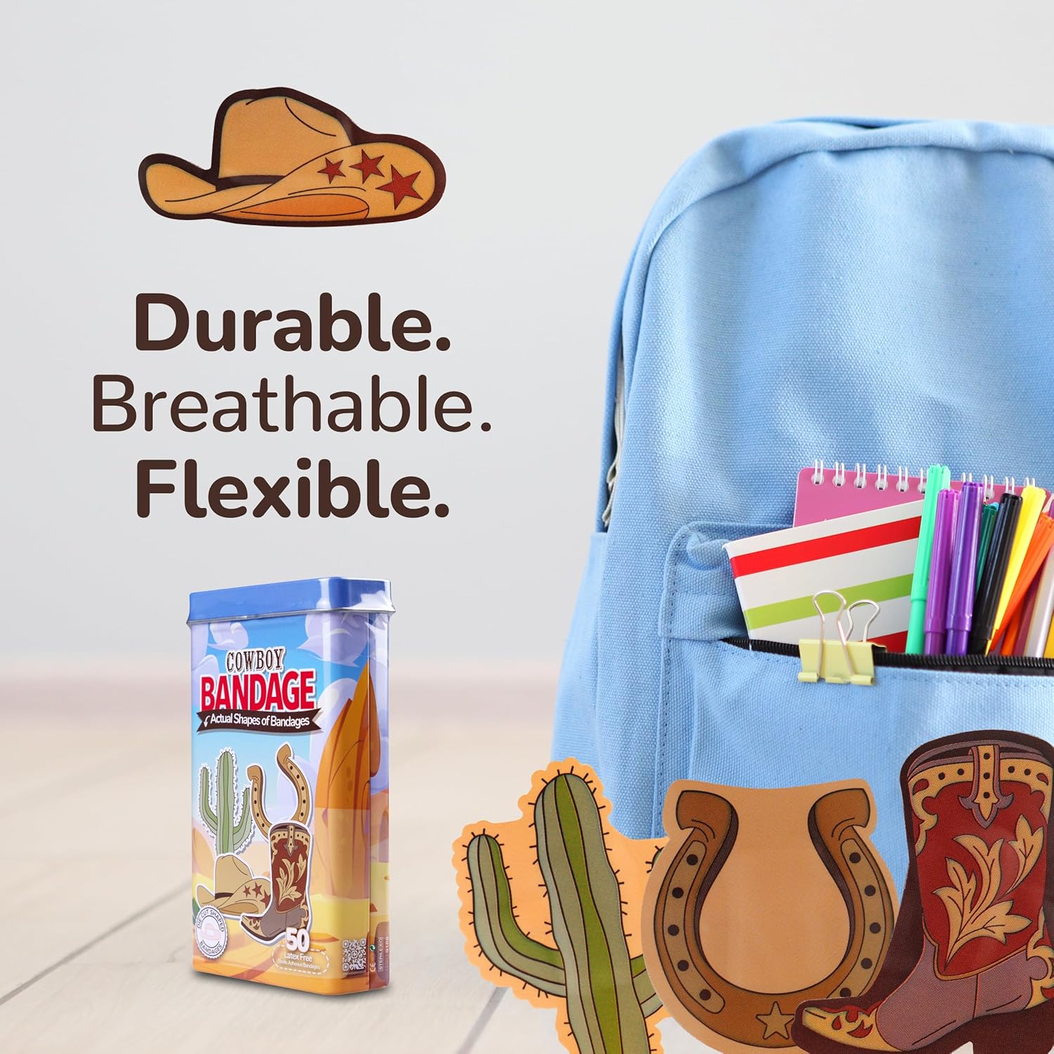 - COWBOY BANDAGES: This 50 piece tin of Cowboy shaped bandages features fun cowboy hat, horseshoe, cactus, and cowboy boot shapes, and is great for putting a smile on kids' faces while protecting wounds such as cuts, scrapes, and burns; sticky bandages come in a cute tin and are perfect for kids and adults alike, and also for school nurses and pediatric doctors