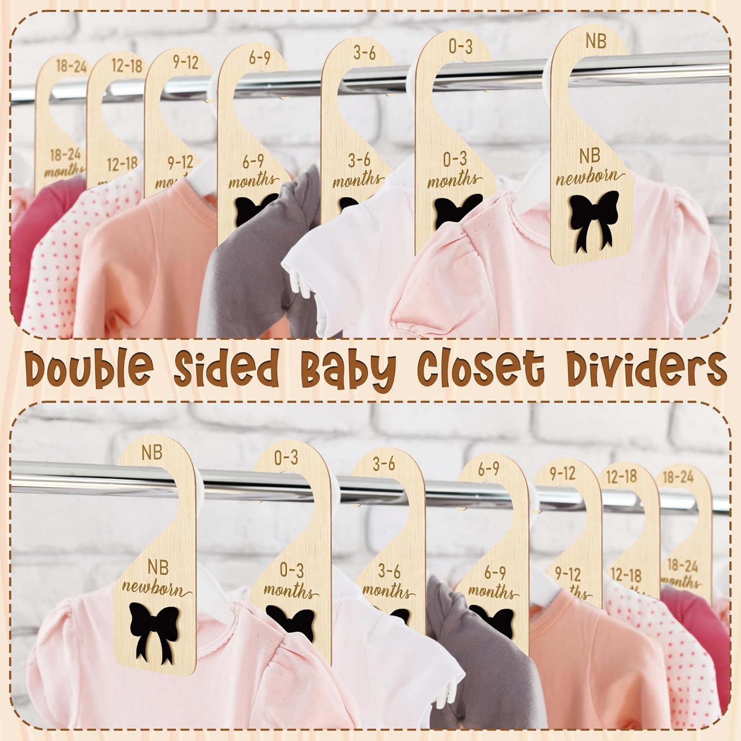 - Black Bow Baby Closet Dividers: Package includes 7Pcs clothing dividers covering all ages from newborn to toddler, Newborn, 0-3 months, 3-6 months, 6-9 months, 9-12 months, 12-18 months, 18-24 months, and 1 black velvet bag. Excellent choice for organizing clothes for parents-to-be.