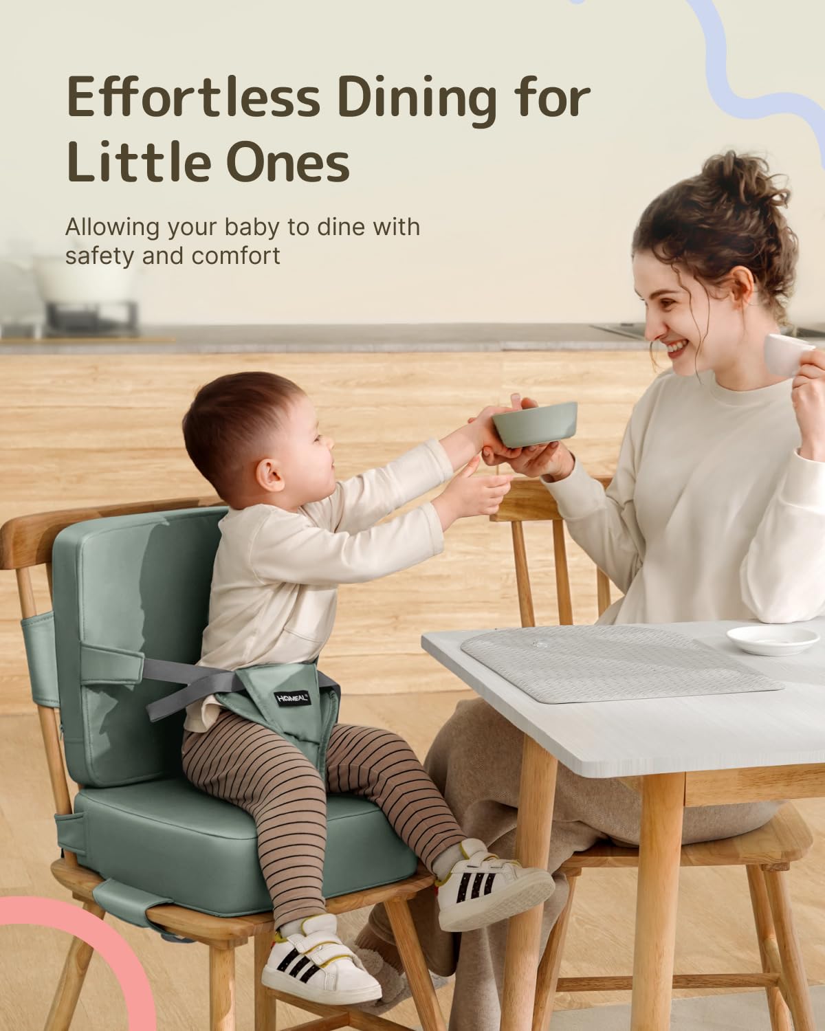 - Secure Design: The HOMEAL booster seat for kitchen chair features adjustable straps and a front buckle, ensuring a secure fit on kitchen chairs. Its non-slip base prevents sliding, offering parents peace of mind during worry-free mealtimes with toddlers