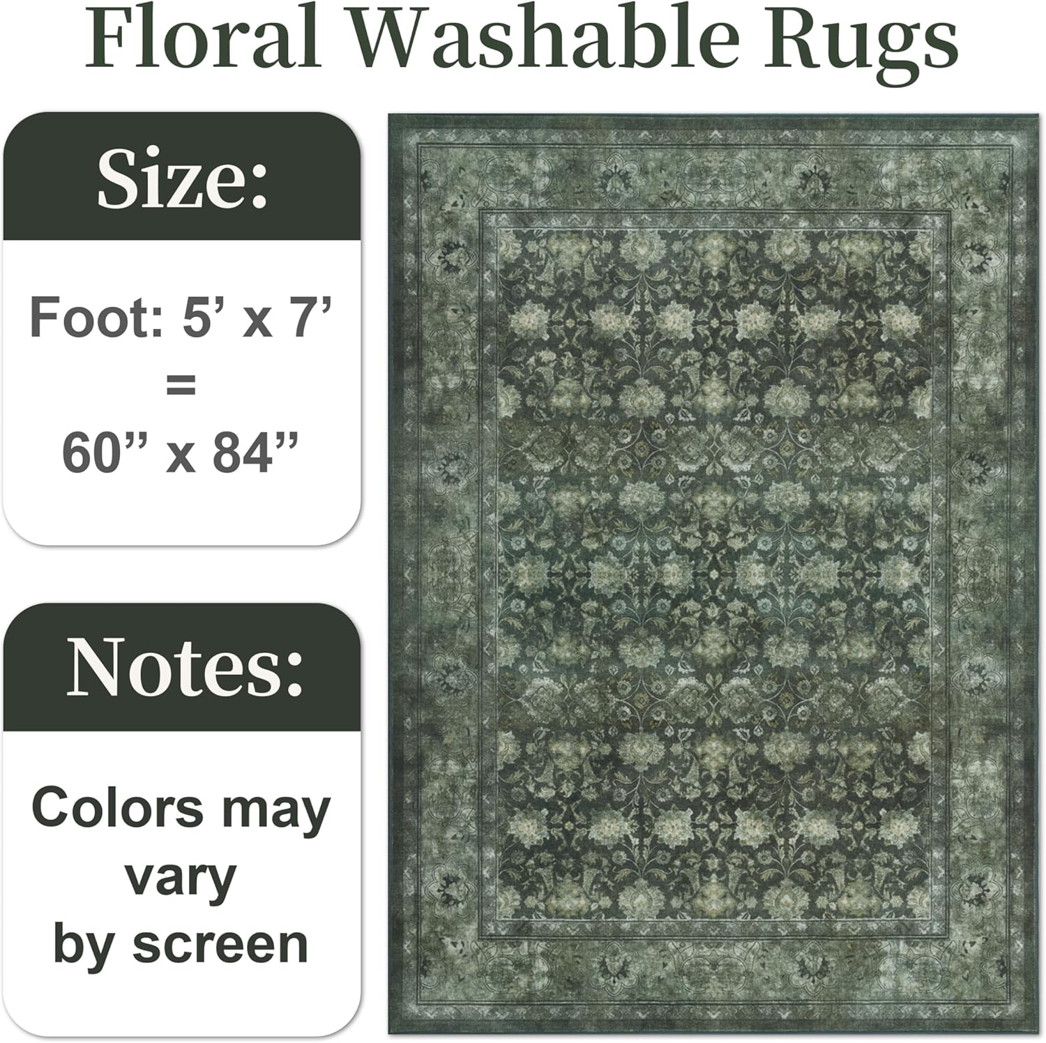 5x7 Washable Area Rug for Living Room, Non Slip Vintage Floral Rugs for Bedroom, Retro Indoor Floor Carpet for Kitchen, Dining Room, Farmhouse, Classroom (Distressed Green)