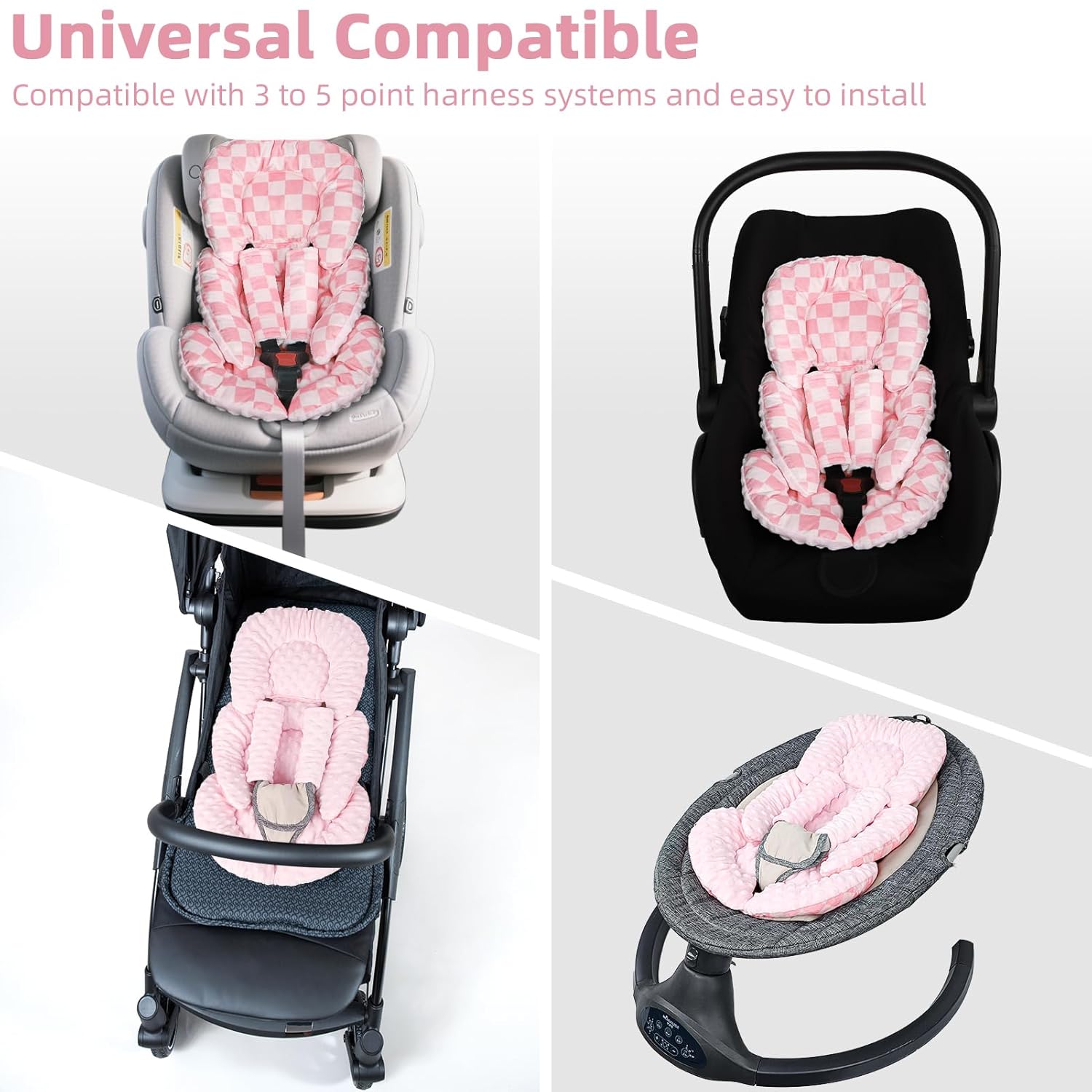 Infant Car Seat Insert Cushion, Baby Car Seat Head Body Support for Girls & Boys, Reversible Newborn Car Seat Insert with 2 Extra Strap Paddings, Premature Car Seat Cushion, Pink Checkerboard