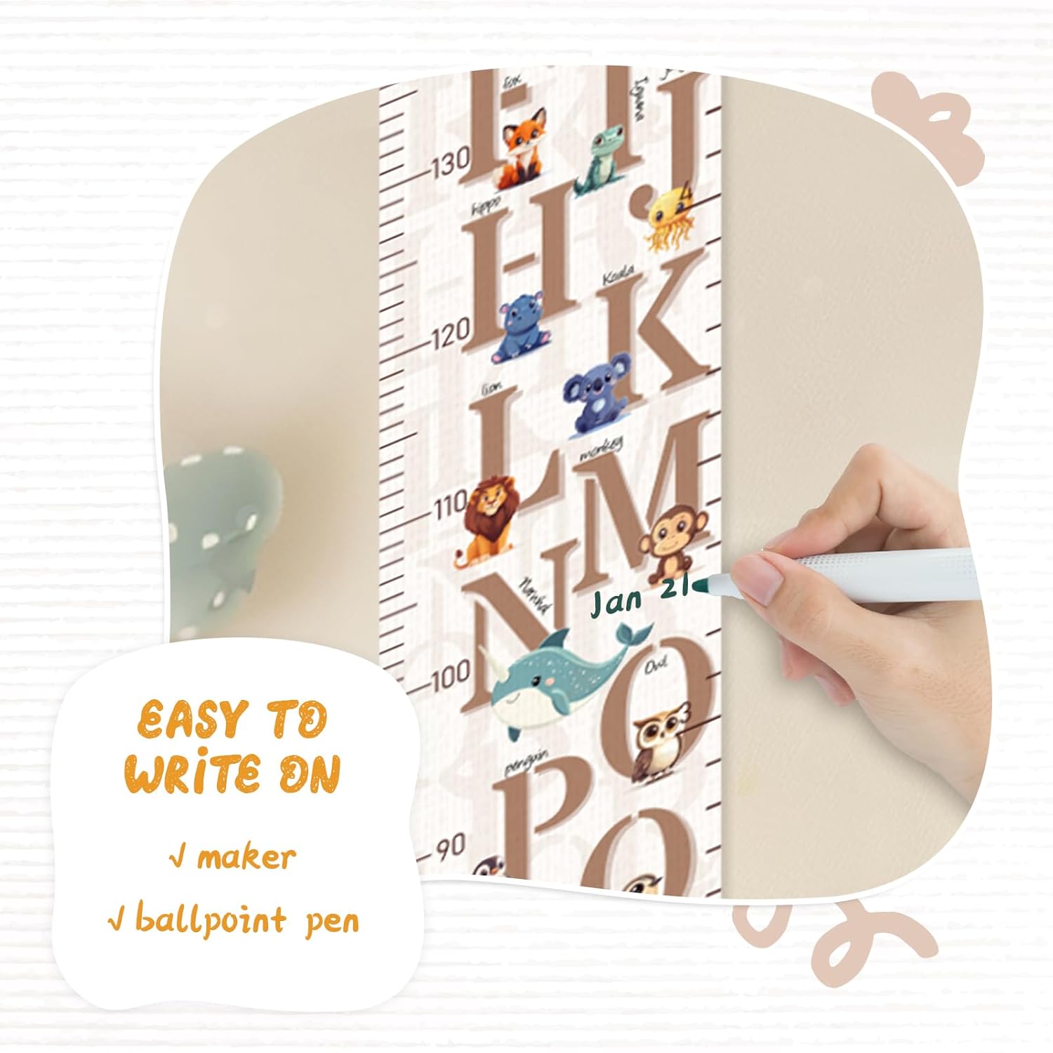 - Design: Kids growth chart with rope at the top of the chart, easy to install and removeable, foldable and portable design, easy to store, hang, roll up, transport, and save space. It boasts a material that's easy to write on, where you can use dark colored ballpoint pens and markers to track growth milestones. Our height ruler can clearly show your kids' height.