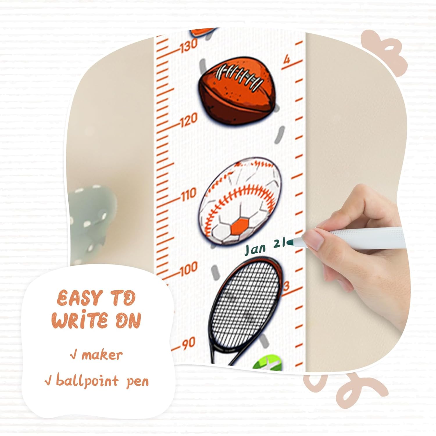 - Design: Kids growth chart with rope at the top of the chart, easy to install and removeable, foldable and portable design, easy to store, hang, roll up, transport, and save space. It boasts a material that's easy to write on, where you can use dark colored ballpoint pens and markers to track growth milestones. Our height ruler can clearly show your kids' height.