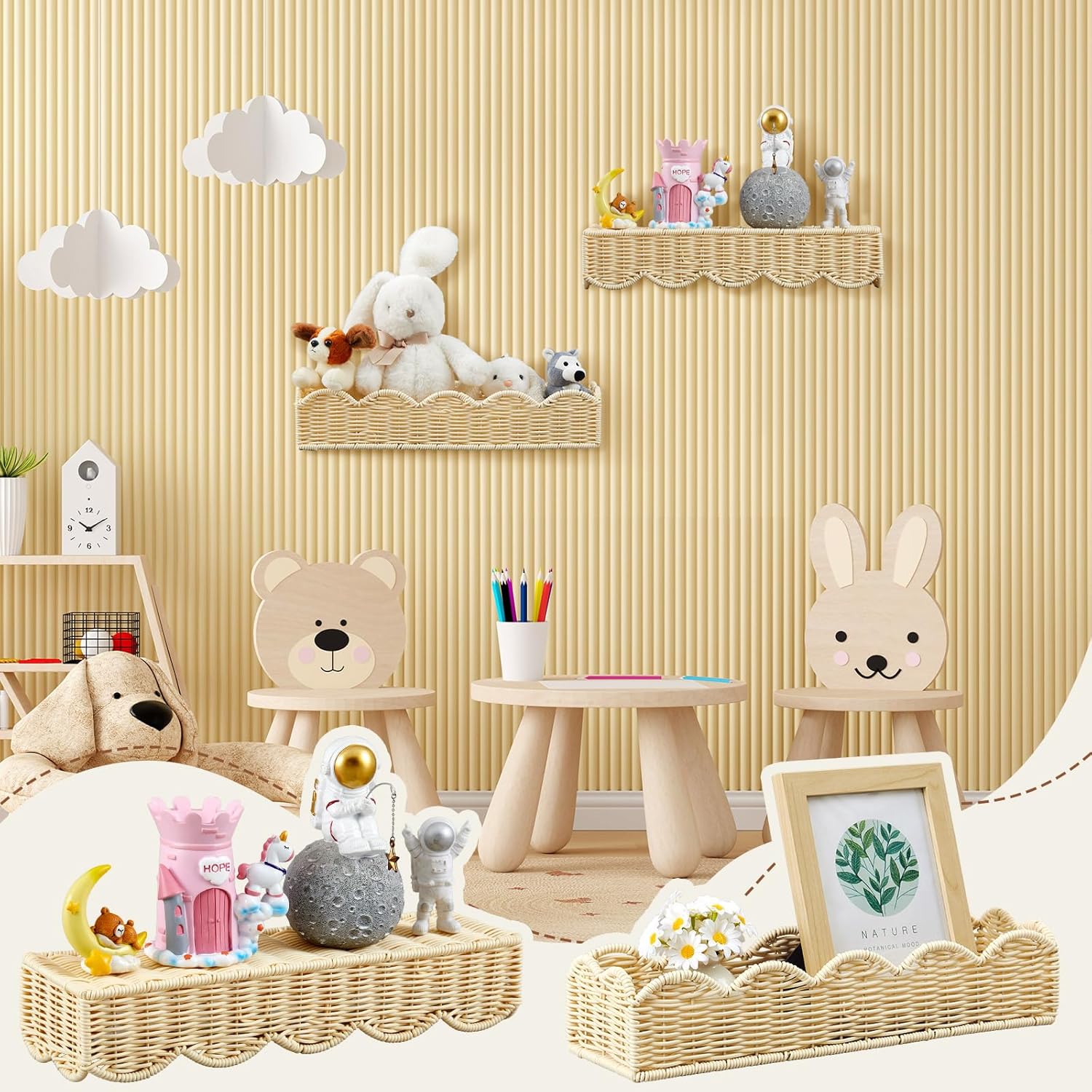 Pinkunn 3 Set Nursery Book Shelves Scalloped Rattan Wall Shelf 15.8 x 3.2 Inch Wall Mounted Plastic Floating Book Shelve, Hanging Boho Wicker Woven Shelf for Nursery Decor and Storage (Boho Beige)