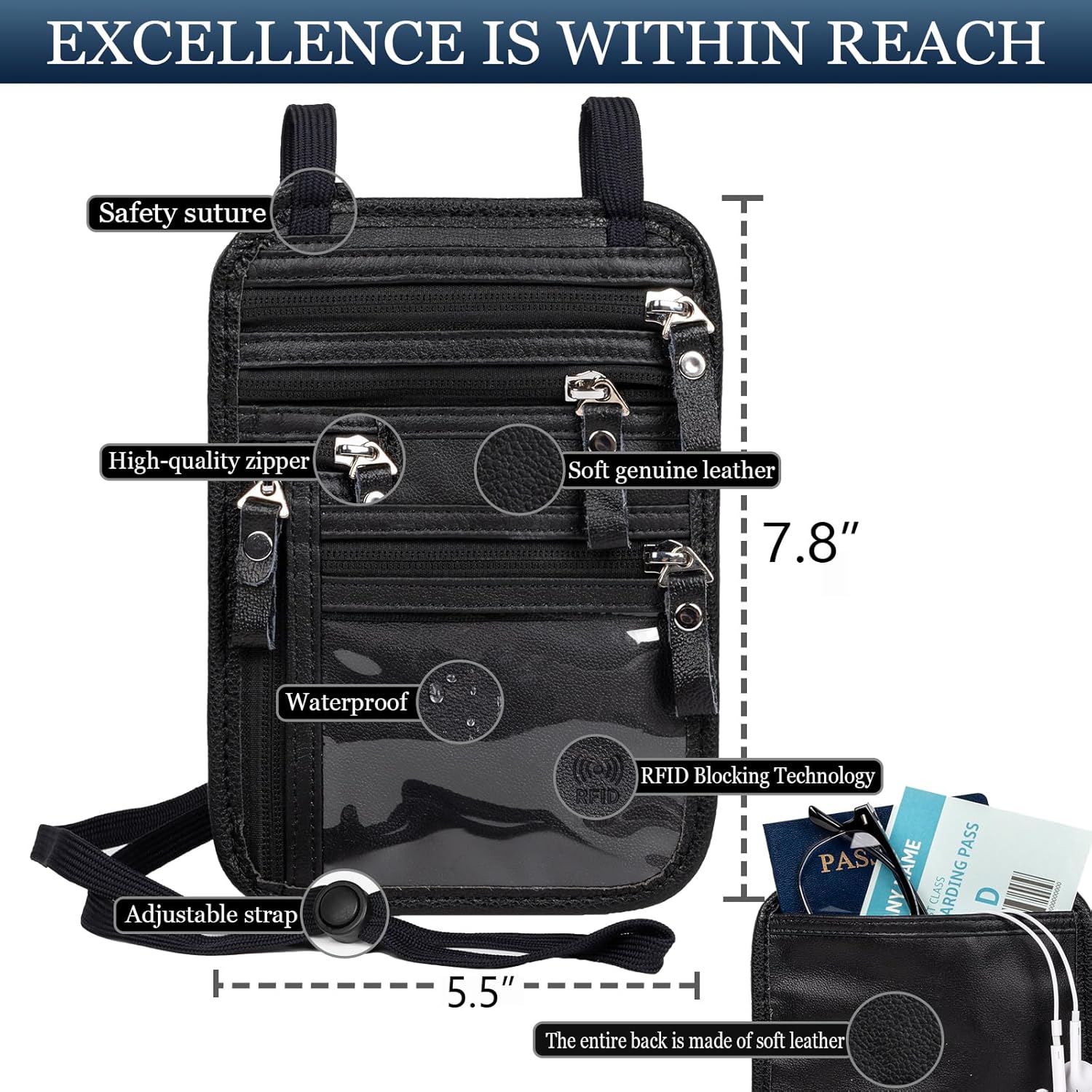 - Spacious And Organized – Size 7.8*5.5in, A Stylish, Easy-To-Use Design, That’S Comfortable And Lightweight. With Zippered Pockets, A Velcro Patch, And A Clear Id Window. Fits Passports & Large Smartphones, Cash, And Tickets.