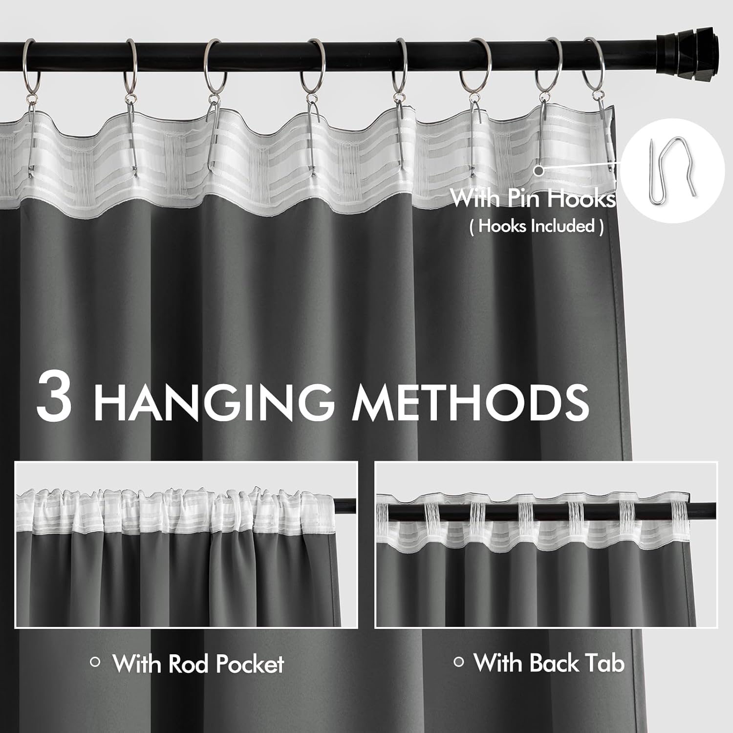 - MULTIPLE HANGING OPTIONS: Each curtain panel features a 3-in-1 top style design: Rod Pocket, Back Tab and Pinch Pleat. The Back loop (2.3 "long) and rod pocket (3.1" long) fit most standard rods. Curtains also can be hung with clip rings or different type of hooks. We will give away 20 pin hooks for each pair of curtains for your convenience (rings won't be included). 3 ways to meet your various needs.
