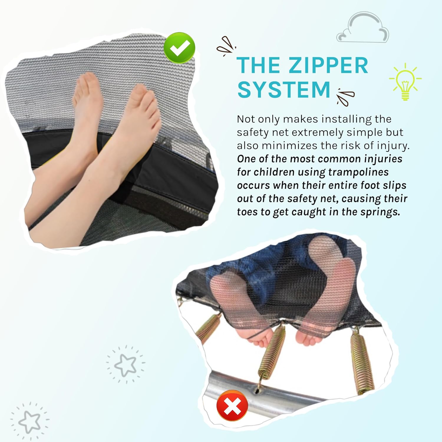 - [ Smart Zipper System, NO-GAP! ]: The innovative zipper system design of our 14ft kids trampoline makes net installation extremely easy, while also ensuring a seamless connection between the mat and the net.