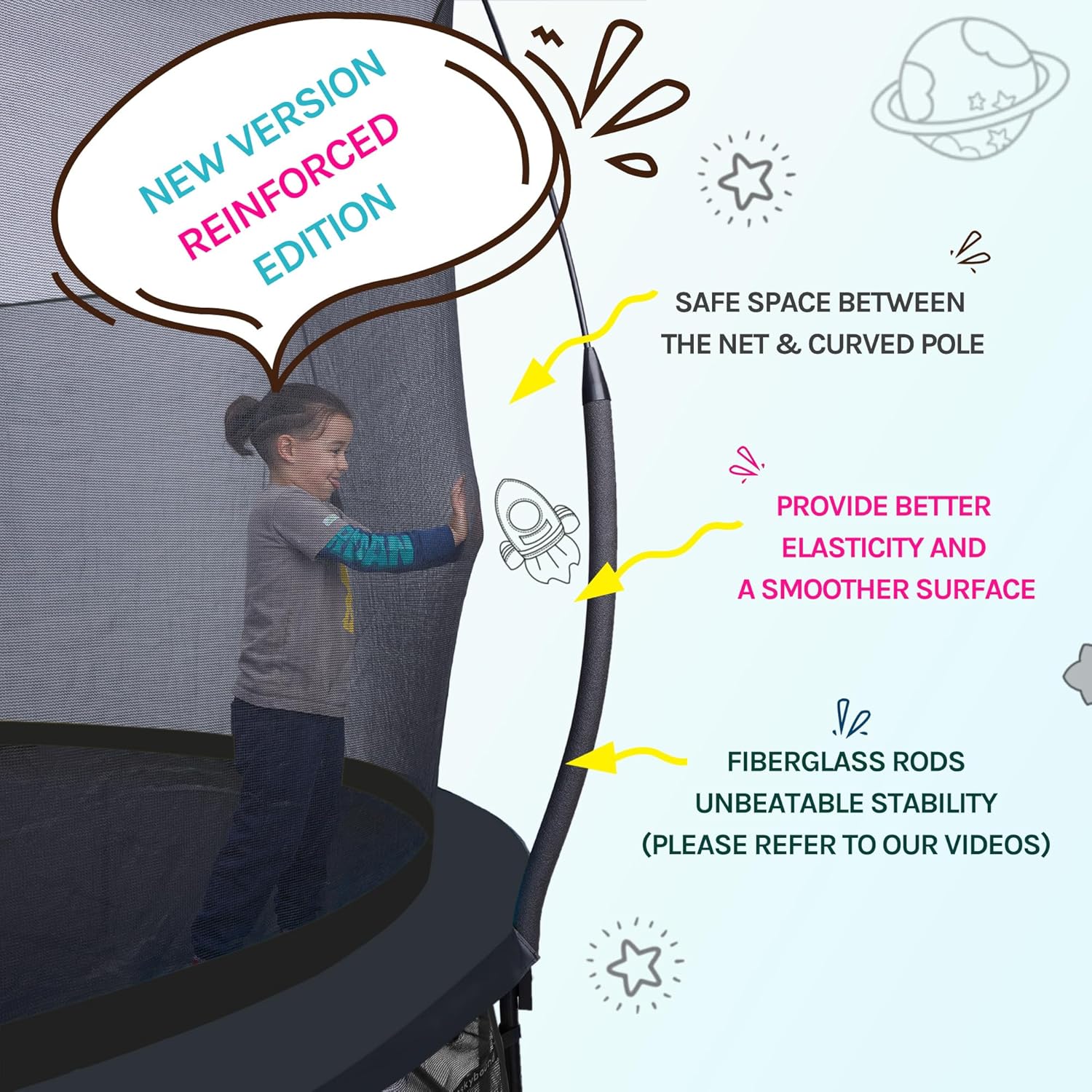 - [ Patented Bungee Cords, NO SPRINGS! ]: Our 14 foot trampolines uses flexible bungee cords instead of metal springs removes any pinch points that might trap feet or toes, reducing the risk of injury.