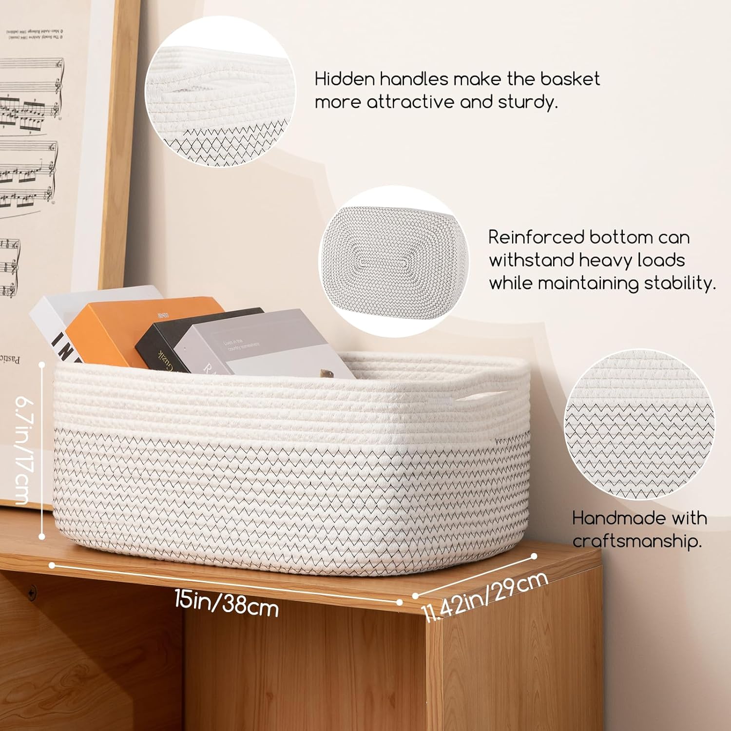 Storage Baskets for Organizing 3 Pack, Woven Baskets for Shelves, Closet Organizer Bins Empty Gift Basket Toy Storage for Toys, Books, Towels, Clothes, 15"x11.42"x6.7", White & Black