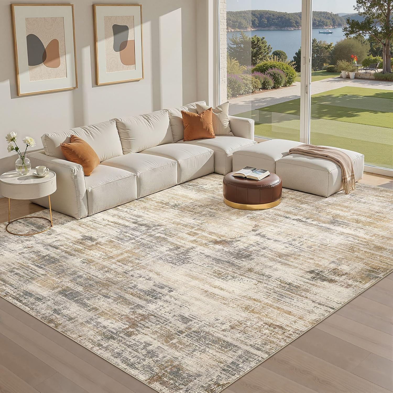 Area Rug for Living Room: 10x12 Washable Neutral Abstract Modern Soft Rugs Non Slip Indoor Floor Stain Resistant Large Carpet for Bedroom Dining Room Office Nursery - Golden Brown