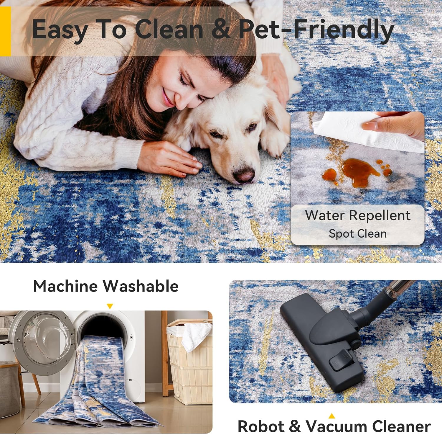 Washable Area Rugs 9'x12' Non-Slip Modern Abstract Soft for Living Room Entryway Bedroom Nursery, Print Pattern, Grey Blue Gold/Golden