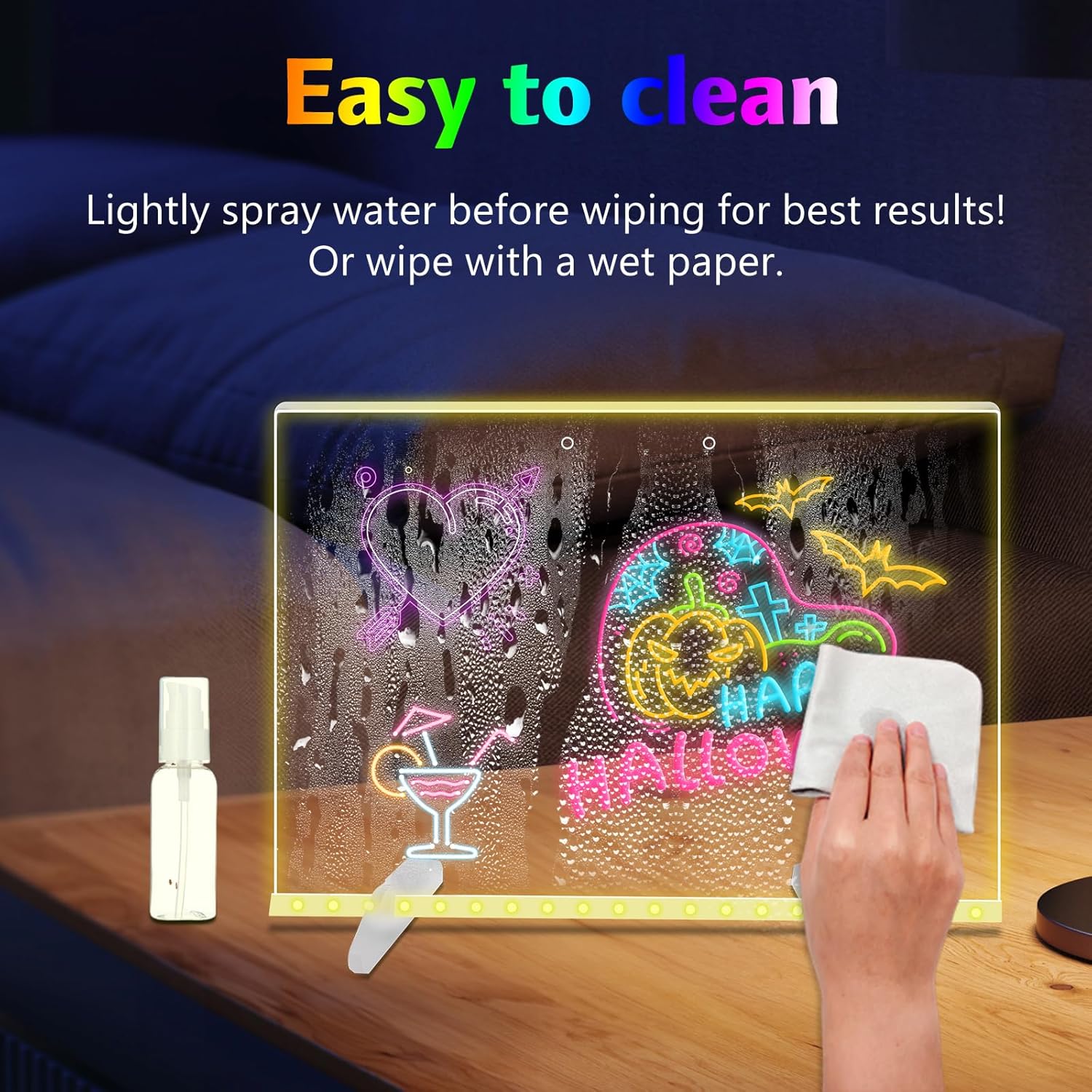 - 🧼 Scratch-Resistant & Easy to Maintain – Crafted with upgraded, water-soluble material, this Dry Erase Board with Light resists scratches and smudges. For a quick clean, just spray with water or wipe with a damp cloth—perfect for mess-free creativity and daily use.
