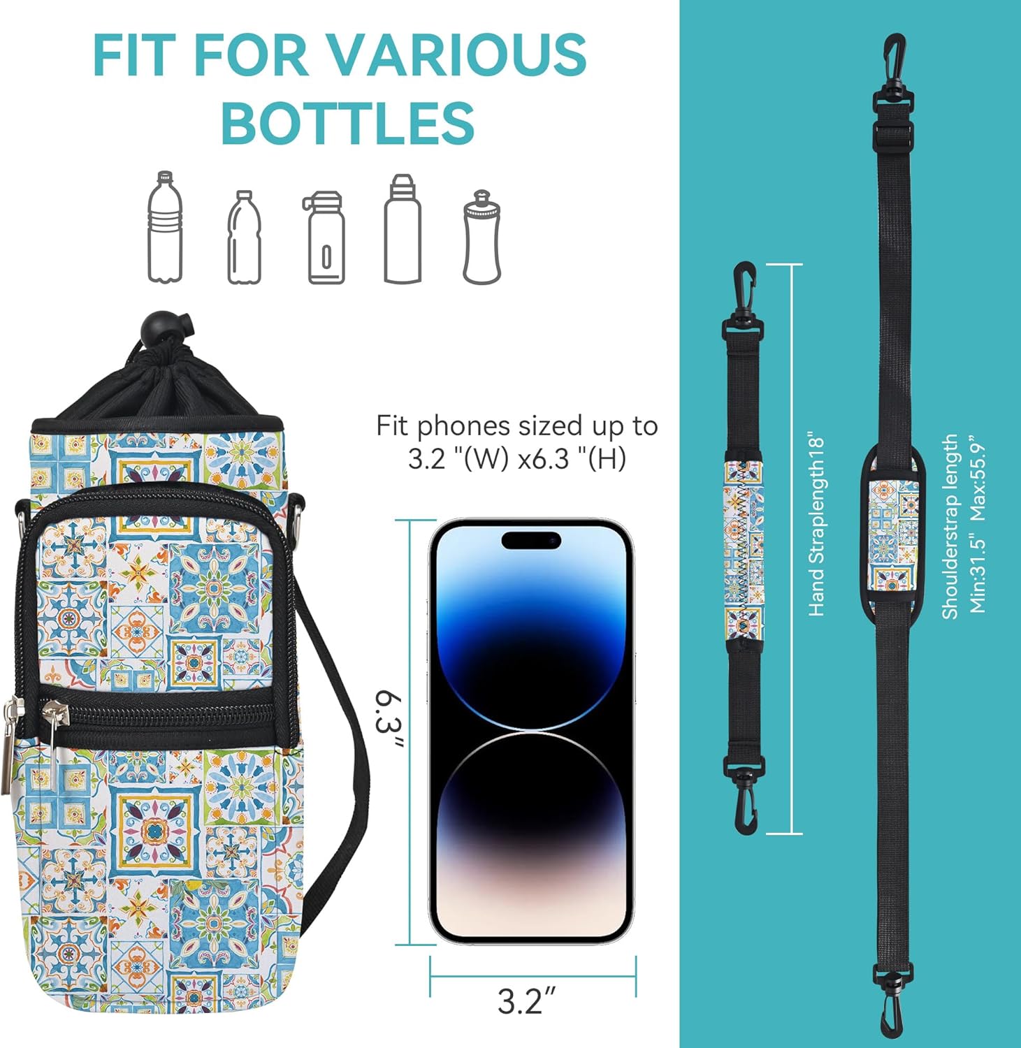 • icolor Crossbody Water Bottle Carrier Holder Pouch with Call Phone Bag have 4 size 25oz(Diameter 3.23",Height 9.05")/32oz(Diameter 3.82",Height 7.87")/40oz(Diameter 3.82",Height 9.05")/64oz (Diameter 5.12",Height 9.06"),Adjustable Padded Shoulder strap about Min:27.1, Max:48.4"