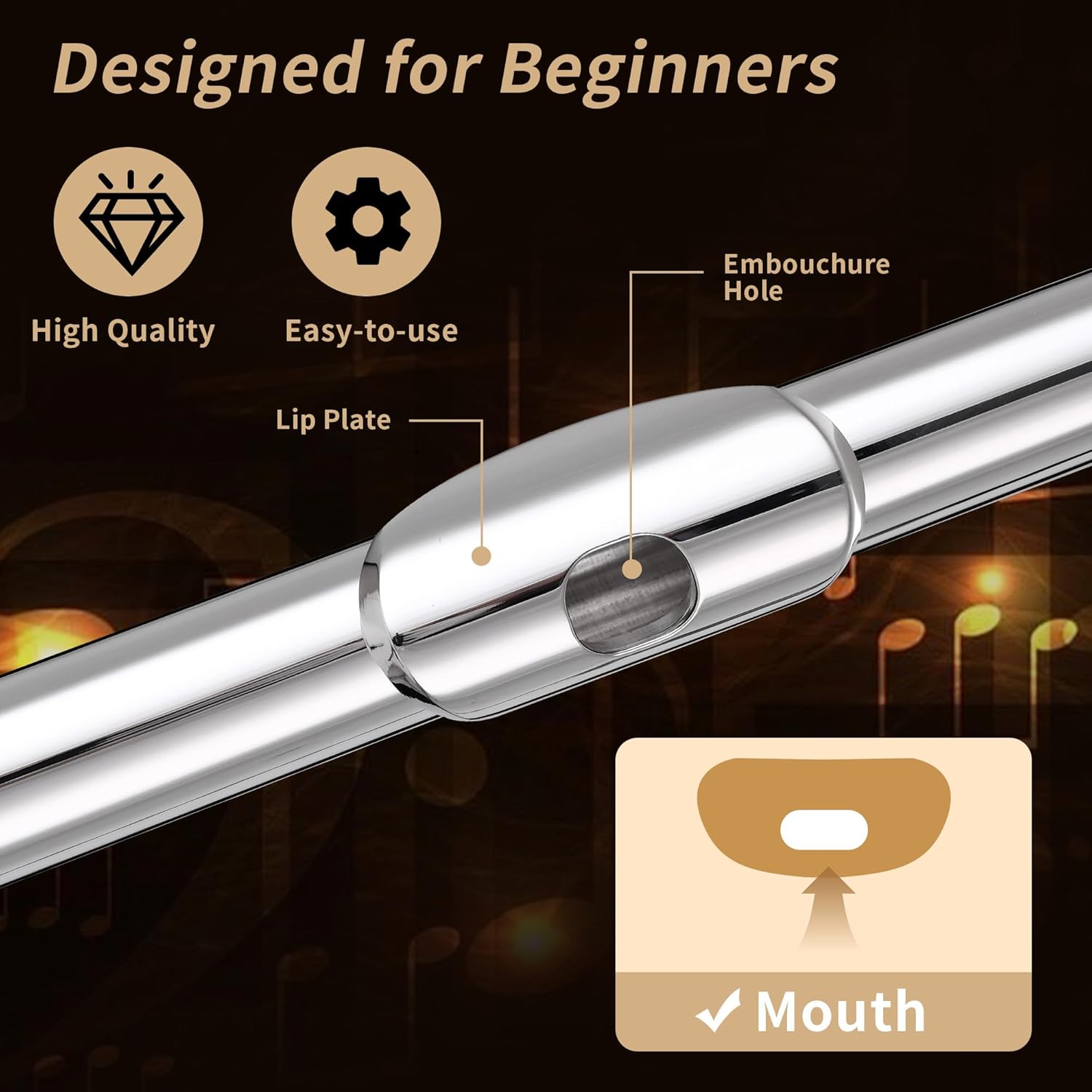 C Flute Closed Hole 16 Key for Beginner Student Silver Flute with Carrying Case Stand Gloves Cleaning Cloth for School Band Instruments