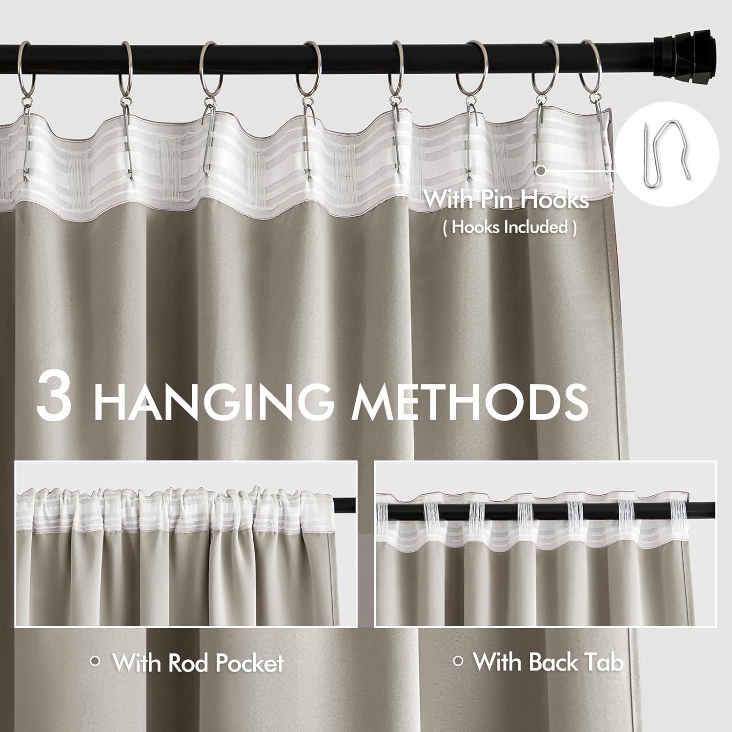 - MULTIPLE HANGING OPTIONS: Each curtain panel features a 3-in-1 top style design: Rod Pocket, Back Tab and Pinch Pleat. The Back loop (2.3 "long) and rod pocket (3.1" long) fit most standard rods. Curtains also can be hung with clip rings or different type of hooks. We will give away 20 pin hooks for each pair of curtains for your convenience (rings won't be included). 3 ways to meet your various needs.