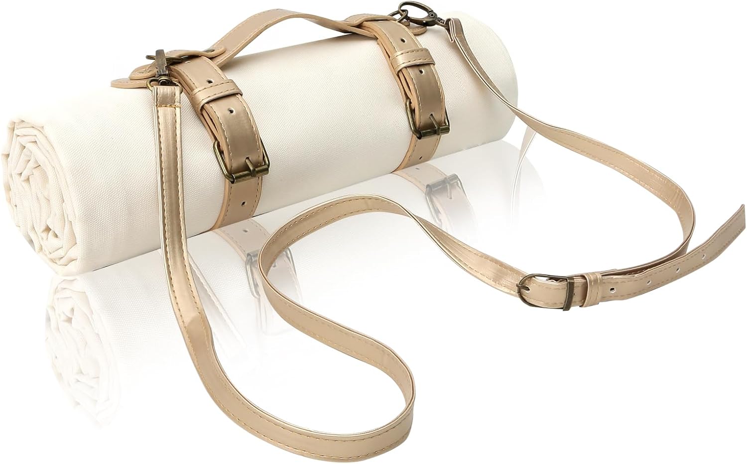 - Includes: 1 white canvas mat, faux leather handle/should strap, and webbing strap