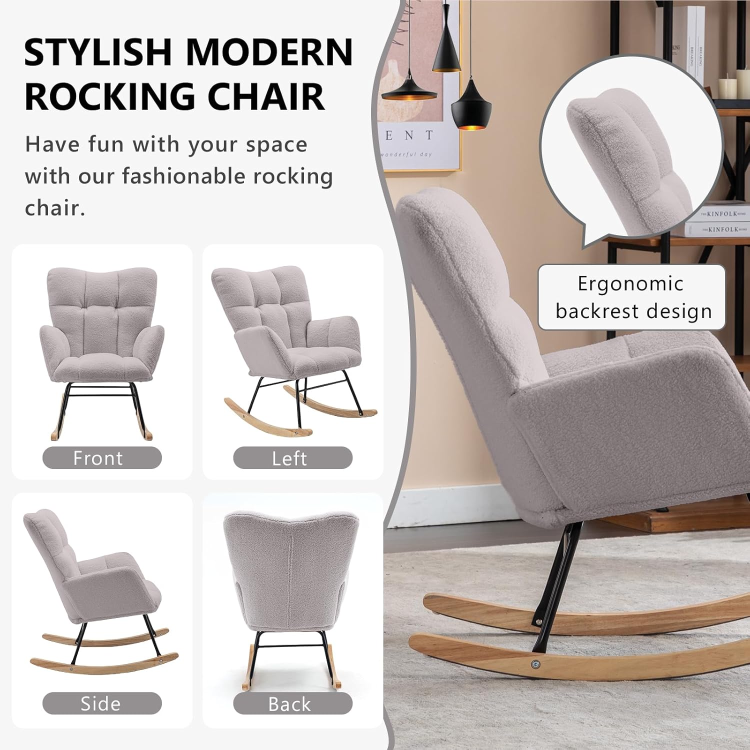 NIOIIKIT Nursery Rocking Chair Velvet Upholstered Glider Rocker Rocking Accent Chair Padded Seat with High Backrest Armchair Comfy Side Chair for Living Room Bedroom Offices (Light Gray)