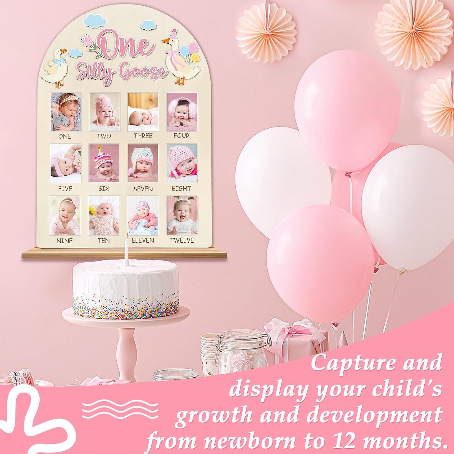 - Package includes: You’ll get 1pcs of one silly goose photo board measuring 16.9 x 12 x 0.2inches, and 2 sheets of adhesive dots for easy installation. Our goose theme birthday wooden board is the ideal keepsake to capture your baby's first year. This 12 monthly milestone picture frame is ideal for displaying cherished photos from each month, creating a beautiful memory of your child's growth and milestones.