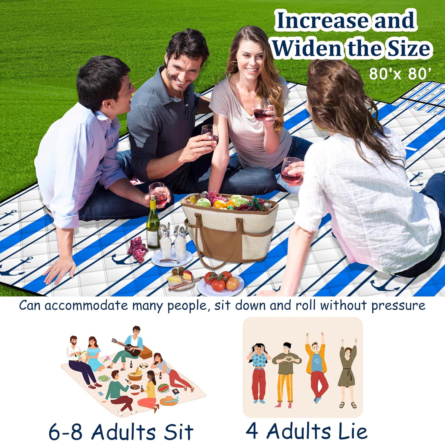 Poedist Extra Large Picnic Blanket Waterproof,80"x 80"Foldable Machine Washable Beach Blanket,Outdoor Blanket for 6-8 Adults,Suitable for Indoor Crawling,Park Beach,Camping,Hiking,Family Travel(Blue)