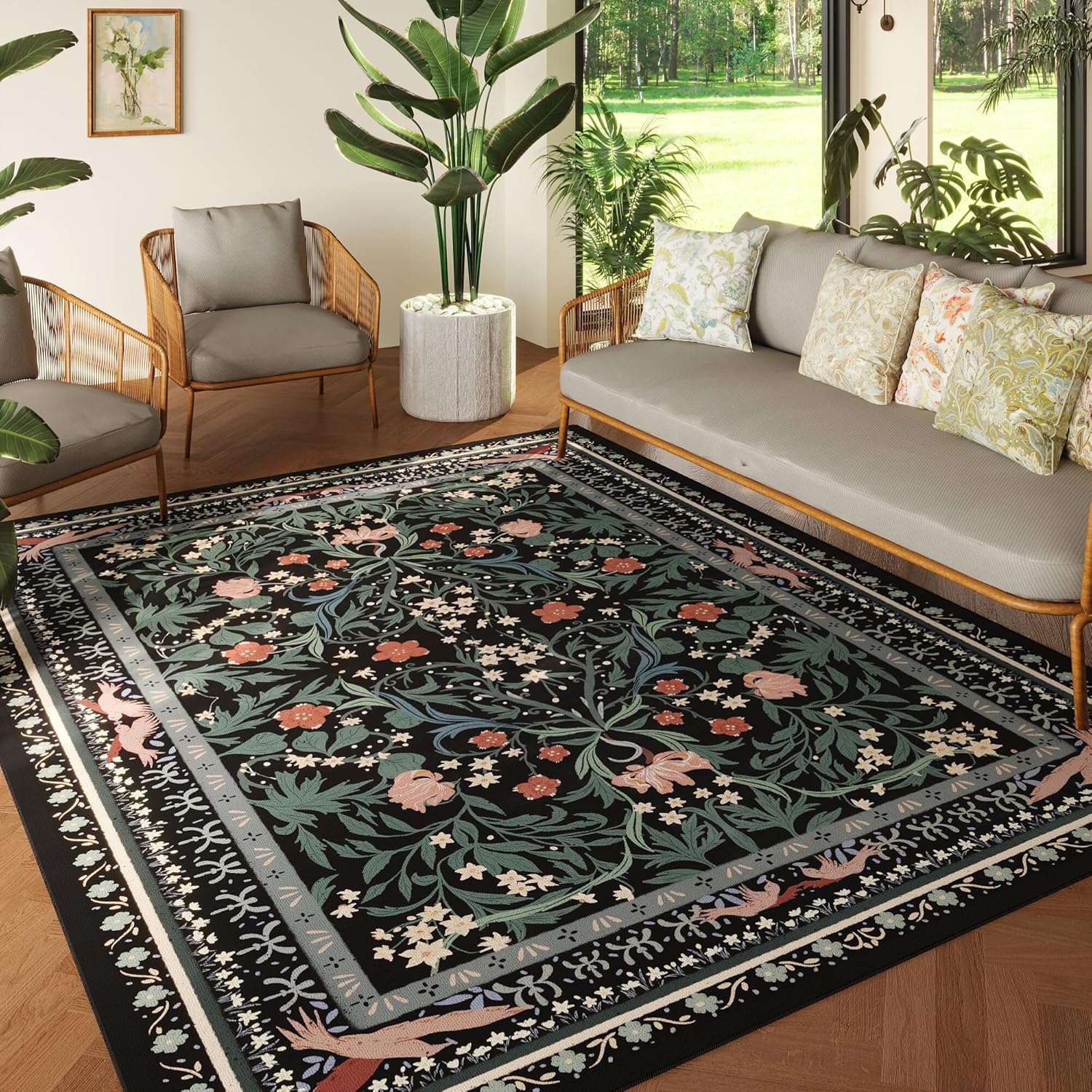 Area Rugs 8x10 for Living Room Clearance Washable Vintage Floral Botanical Rug Non Slip Low Pile Large Rug for Bedroom, Farmhouse, Dining Room, Kids Playroom, Black