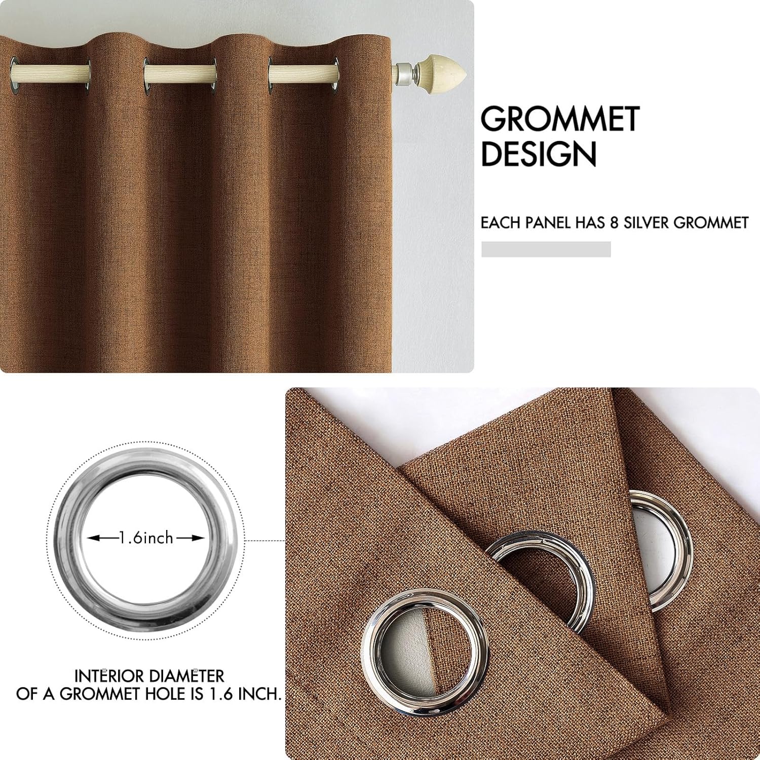 - SIZE & MATERIAL:Set includes 2 panels blackout curtains(52" Wide by 108" Long). Each panel has 8 grommets.The interior diameter of hole is 1.6 inch.It's easy to hang. Curtains are made by quality faux linen.