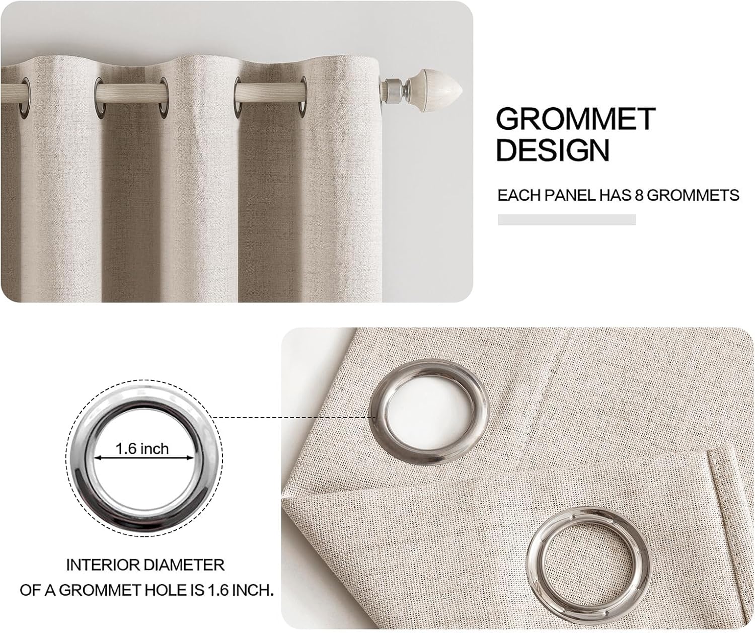 - SIZE & MATERIAL:Set includes 2 panels blackout curtains(52" Wide by 72" Long). Each panel has 8 grommets.The interior diameter of hole is 1.6 inch.It's easy to hang. Curtains are made by quality faux linen.