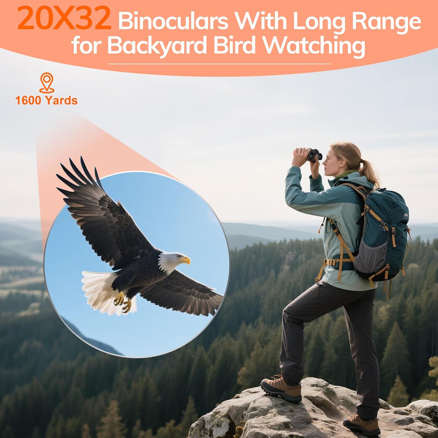 - 20x32 Compact Binoculars for Adults: Our binoculars compact feature a 20x magnification and large objective lenses, allowing you to easily explore the clear details of the world without any shake. Compared to other 15x binoculars, our binoculars enhance clarity by 30%. Perfect for birdwatching, you and your family can use this compact binocular anytime.