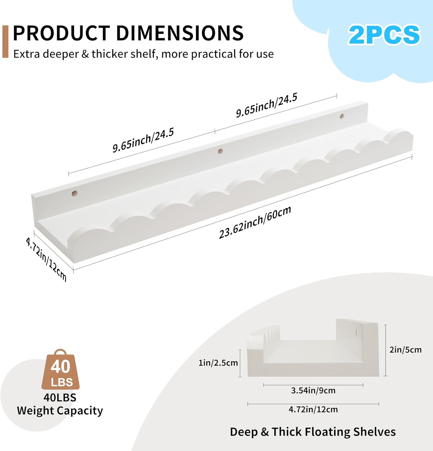 - ăStylish Scalloped Designă This scalloped floating shelves has a scalloped rounded front with smooth rounded corners and a minimalist design that is child friendly to use while adding a touch of sophistication to any room. Perfect for organizing bookshelf, toys and school materials, this nursery book shelves can also be used as children's room dĂ©cor to add a cute and fun element to their room