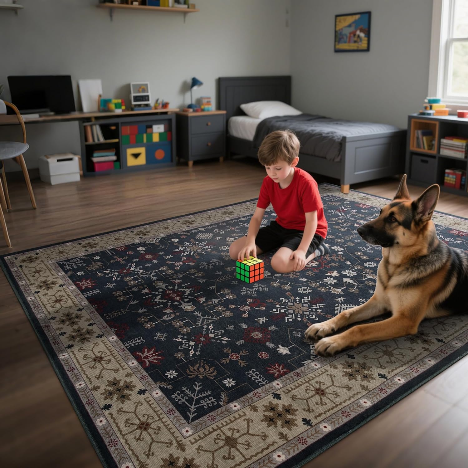 - Kid & Pet-Friendly Rug: The washable rug handles spills and playtime messes-spills, stains... The 0.2-inch low-pile design prevents pet dander and hair from getting trapped inside, avoids them from chewing or scratching and protect your floors