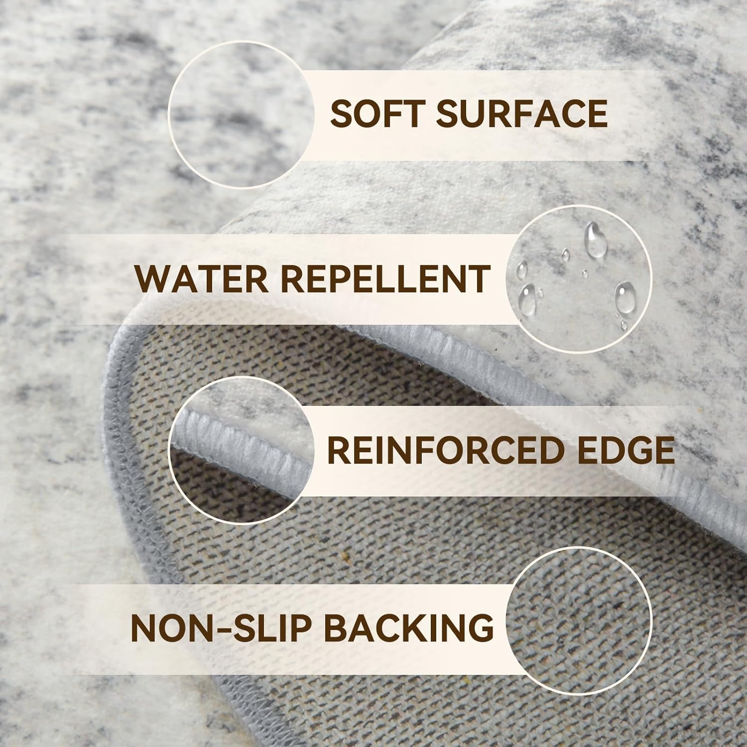 - Tides Series โ Effortless style that flows with your life.This modern machine-washable non-slip rug features reinforced edges and a low-pile design that resists dirt. Its water-repellent surface makes spills easy to clean - liquids bead up for quick wiping. Simply machine wash in cold water (no bleach) to refresh. The non-slip backing keeps it securely in place. A perfect blend of function and contemporary design for active homes.