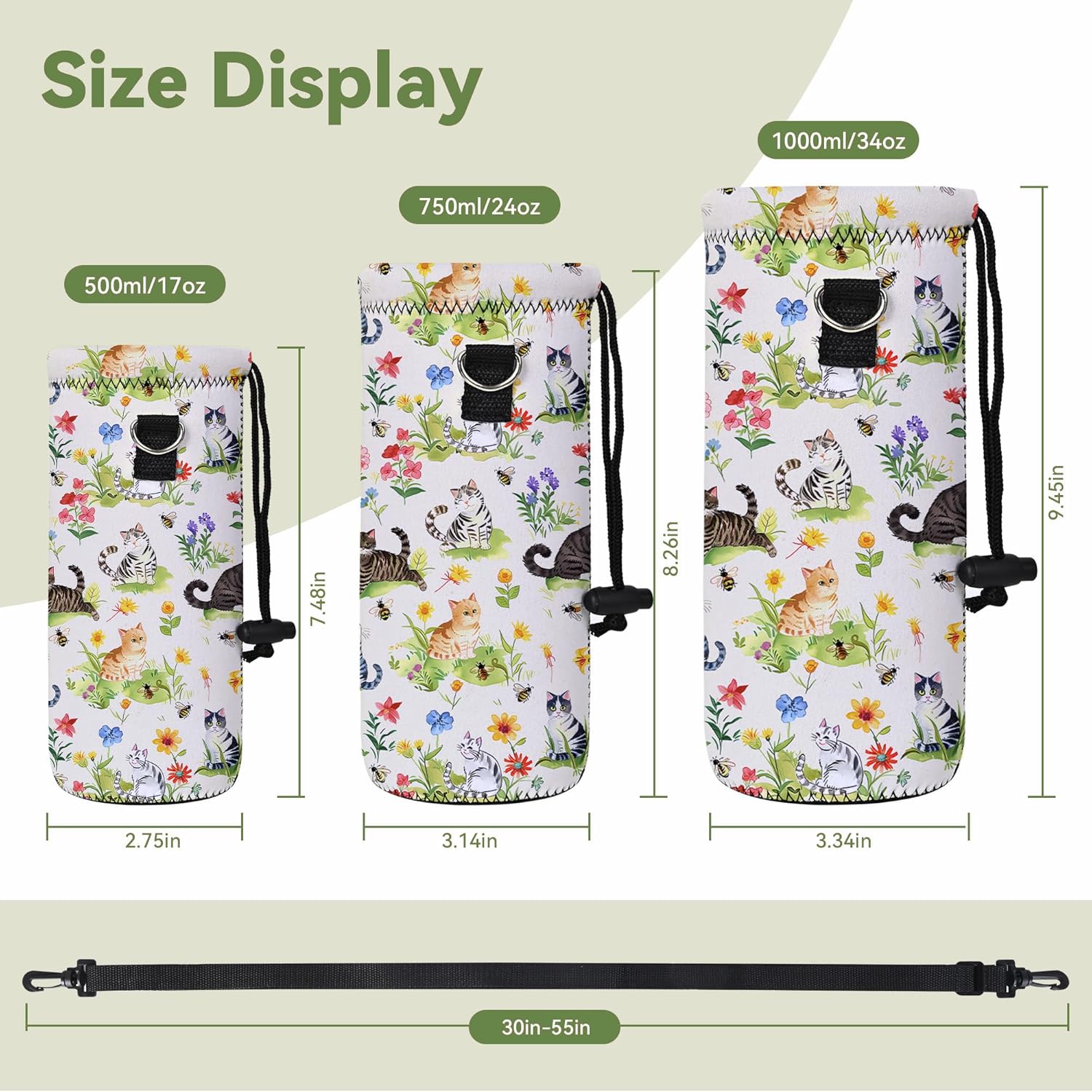• Three Size for your choice: 500ML(16.9oz) water bottle bag,Length-7.48 inches,Diameter-2.75 inches;750ML(24oz) water bottle holder,Length-8.26 inches,Diameter-3.14 inches;1000ML(34oz) water bottle carrier,Length-9.45 inches,Diameter-3.34 inches.
