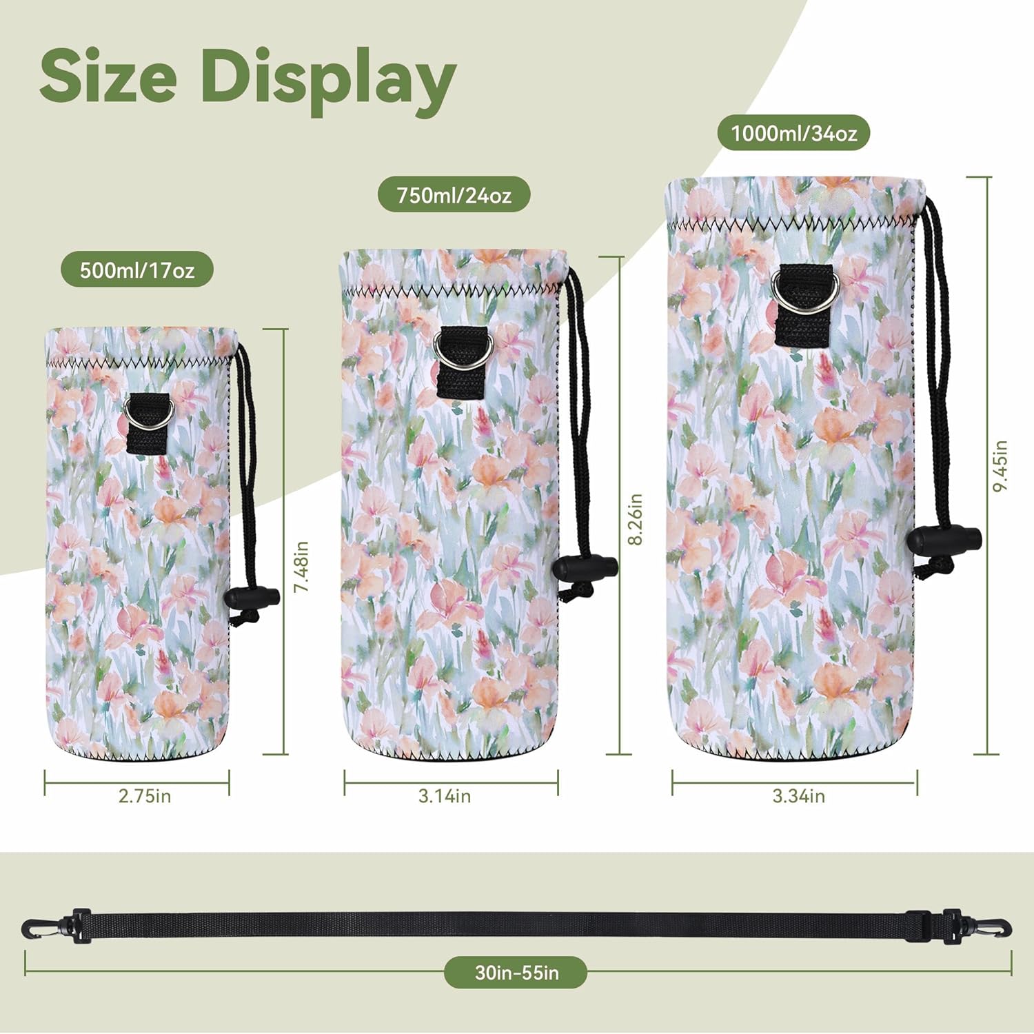 - Three Size for your choice: 500ML(16.9oz) water bottle bag,Length-7.48 inches,Diameter-2.75 inches;750ML(24oz) water bottle holder,Length-8.26 inches,Diameter-3.14 inches;1000ML(34oz) water bottle carrier,Length-9.45 inches,Diameter-3.34 inches.