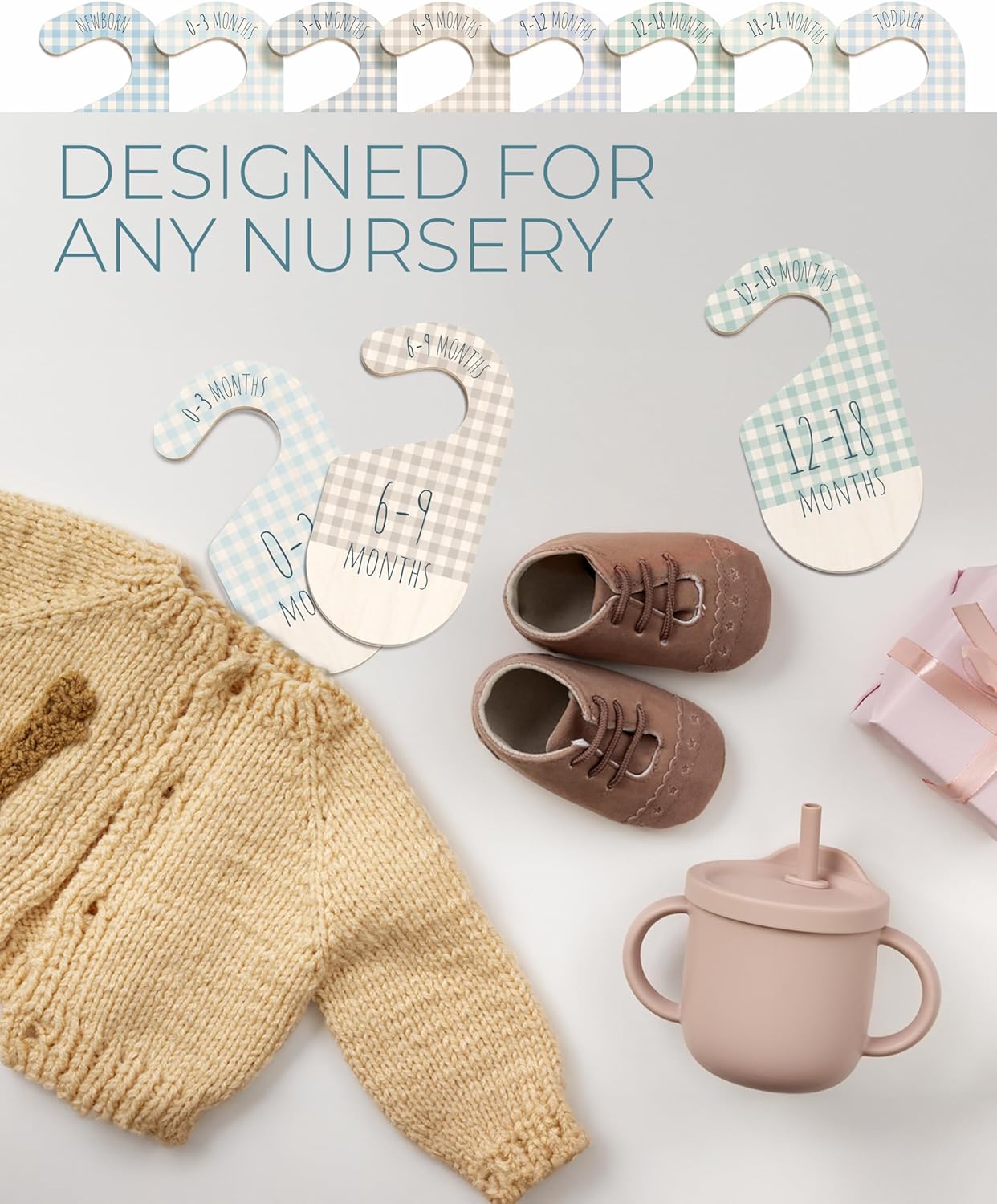 - COMPLETE SET OF BABY ORGANIZERS & STORAGE: Includes 8 beautifully crafted wooden closet dividers in soft blue gingham patterns and a sleek, minimalistic gift box. Perfect not only for sorting baby clothes from newborn to toddler sizes but also as baby room decor.
