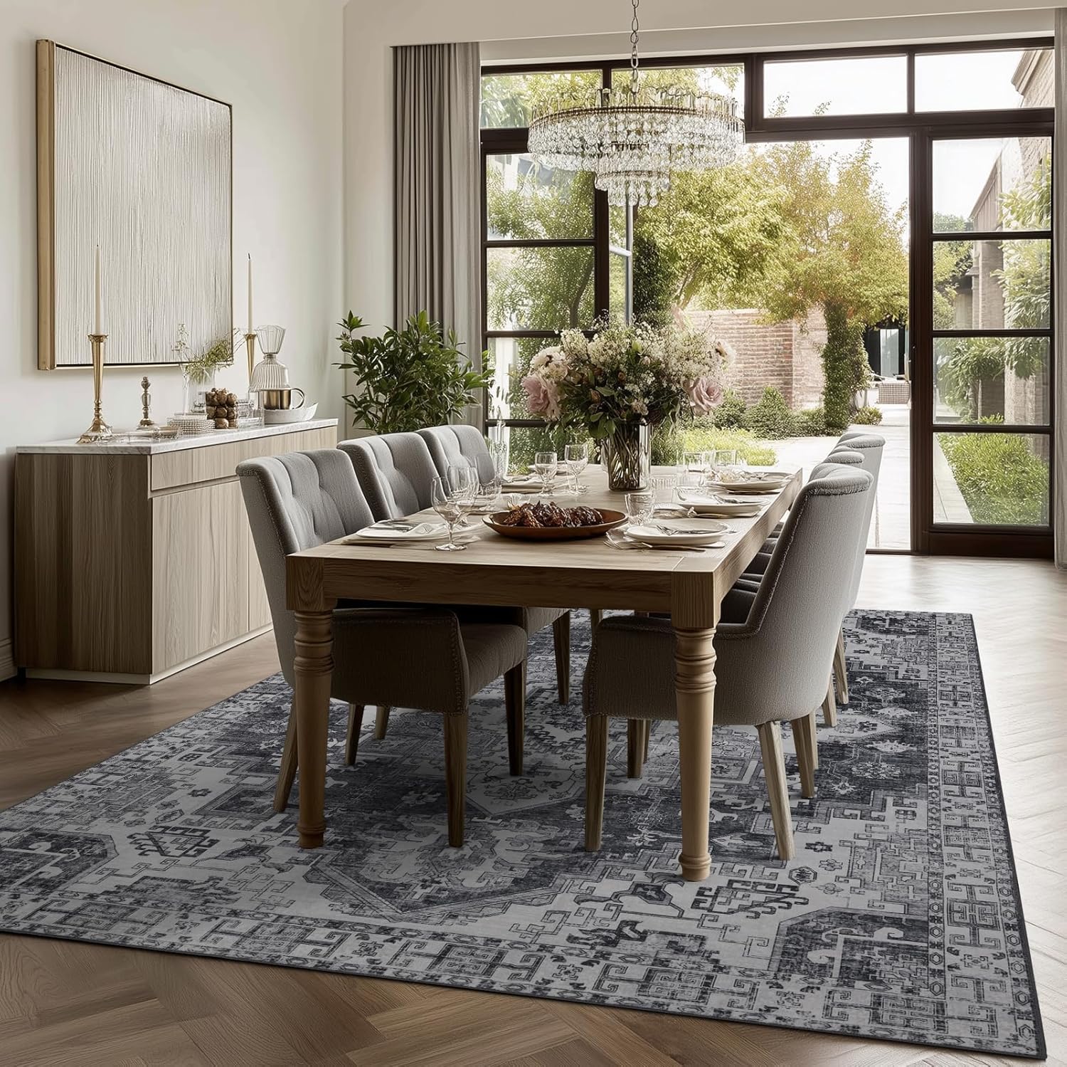 9x12 Area Rug Living Room Rugs, Stain Resistant Washable Rug, Vintage Large Non-Slip Backing, Low Pile Lightweight Print Rug for Bedroom Dinning Room Home Office (Medium Gray)