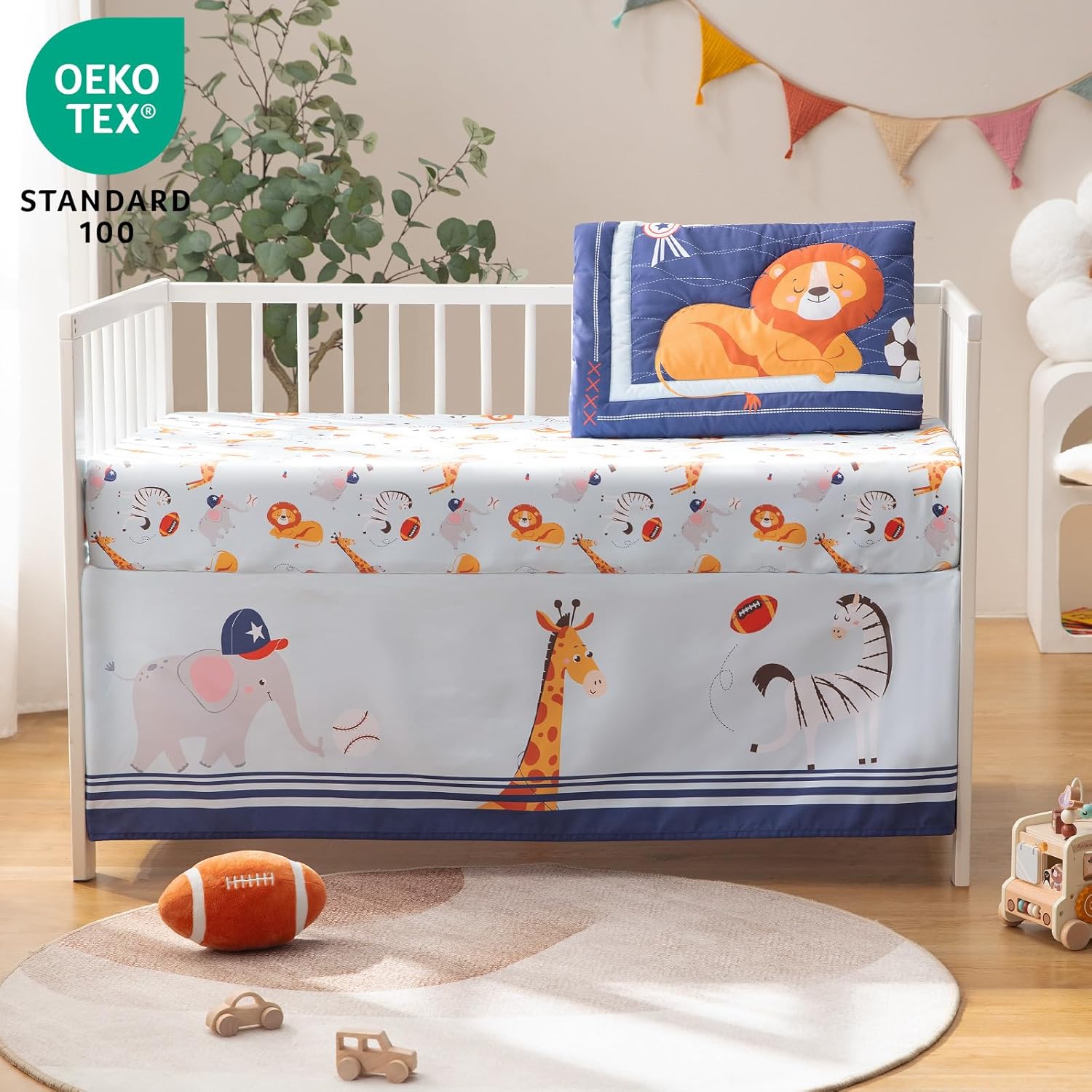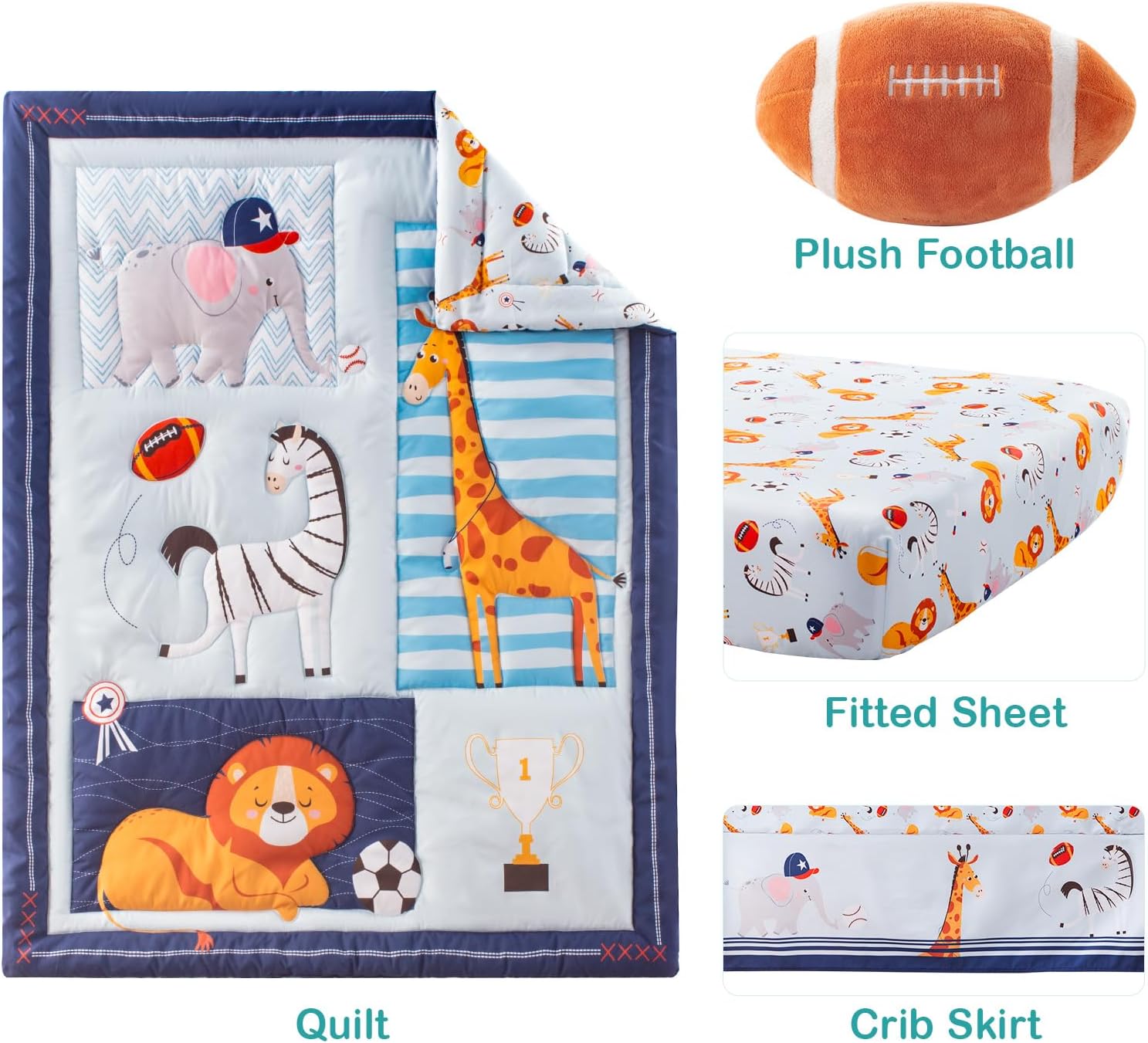 - Nursery Baby Crib Bedding Set Includes: Cartoon comforter, baby crib bed sheet, bed skirt, and plush football. It comes with cartoon elements such as football, lion, zebra, giraffe, mermaid, and elephant, which will be a favorite for your babies. The 4-piece crib bedding set in colorful designs will stimulate the baby's curiosity and exploration of nature.