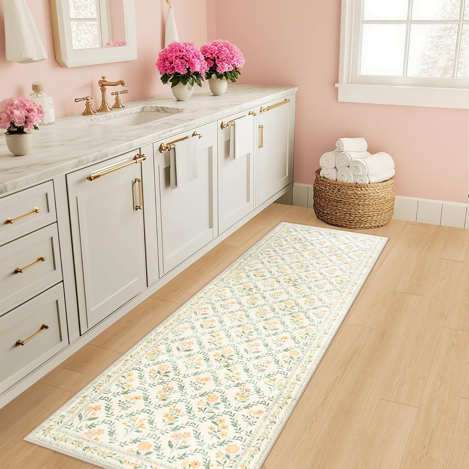 Runner Rug for Entryway: 2x10 Kitchen Rugs Non Slip Washable Ultra-Thin Soft Floral Carpet Indoor Floor Stain Resistant Carpets for Hallway Bedroom Kitchen Laundry Bathroom Dorm Beige/Multi