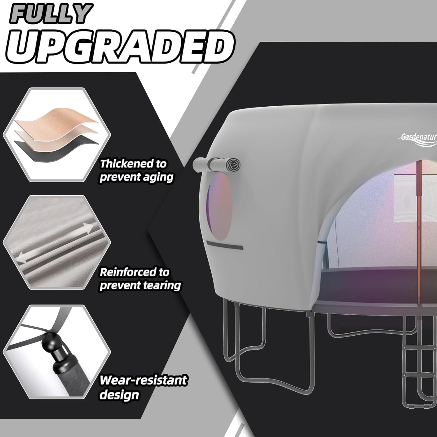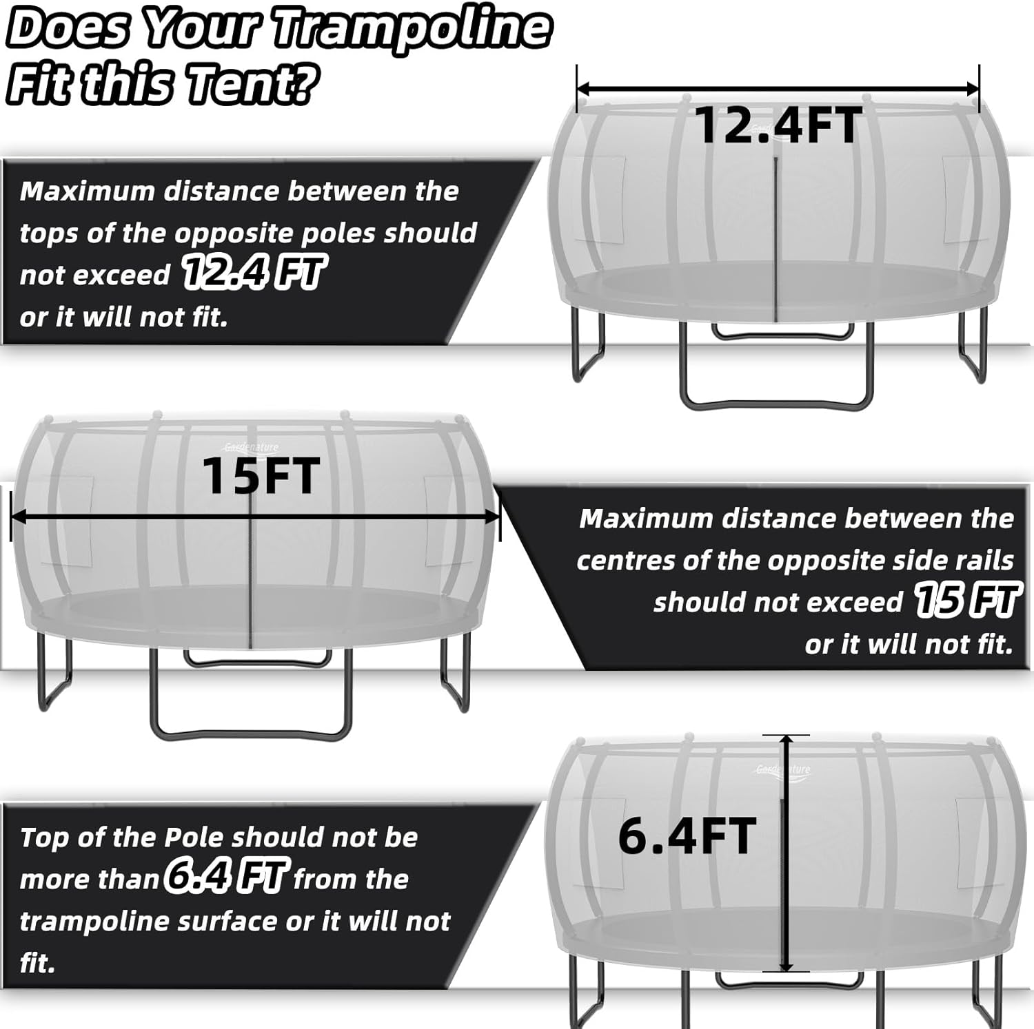 - [New 2025 Version,Perfect Fit for 14FT Round Trampolines] The Gardenature trampoline tent is specifically designed for 14FT round trampolines and comes with 8 curved support poles (poles sold separately). Please measure your trampoline before purchase to ensure a perfect fit, and enhance your trampoline setup with this innovative accessory.