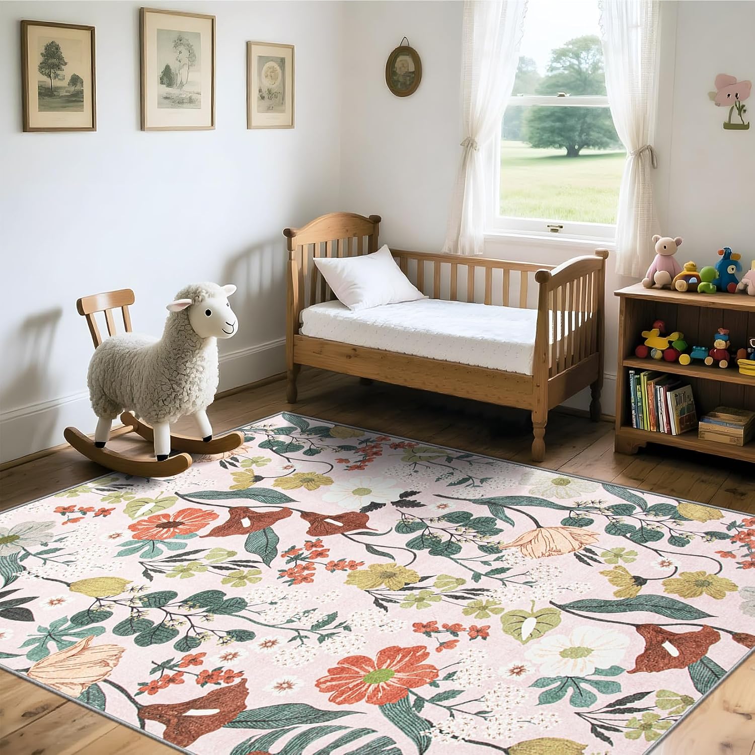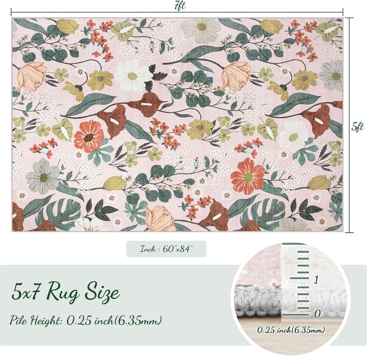 Area Rug Living Room Rugs: 5x7 Washable Rug Vintage Floral Soft Boho Non Slip Carpet Indoor Floor Non Shedding Low Pile Thin Carpets for Bedroom Dining Room Farmhouse Nursery Home Office Light Pink
