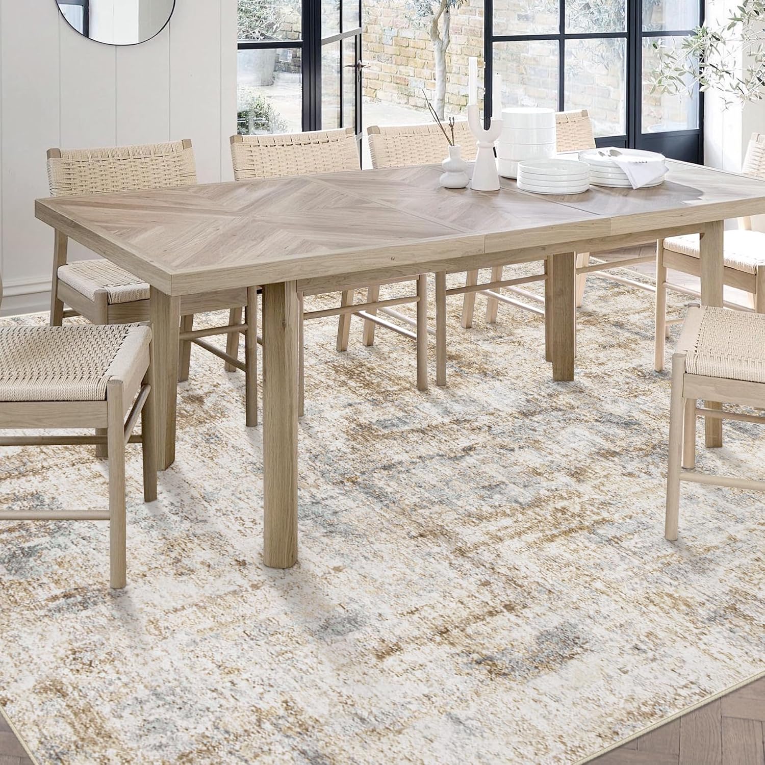 - Anti-Stain Low Pile Rug: Our washable rugs surface pile are short and dense, can block dust and hair embedded, spilled drinks coffee and other liquids will not penetrate into the neutral rug inside; Our 5' x 7' large rug is moderately thick and won't snag on doors, which not only keeps indoor rugs clean, but also adds convenience for high traffic areas.