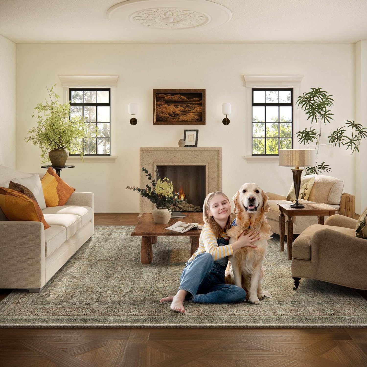Washable Area Rugs for Living Room: 6x9 Bedroom Rug Boho Vintage Rugs Stain Resistant Non Slip Low Pile Lightweight Soft Carpets for Dining Room Kitchen Nursery Kids Room Farmhouse Living Room
