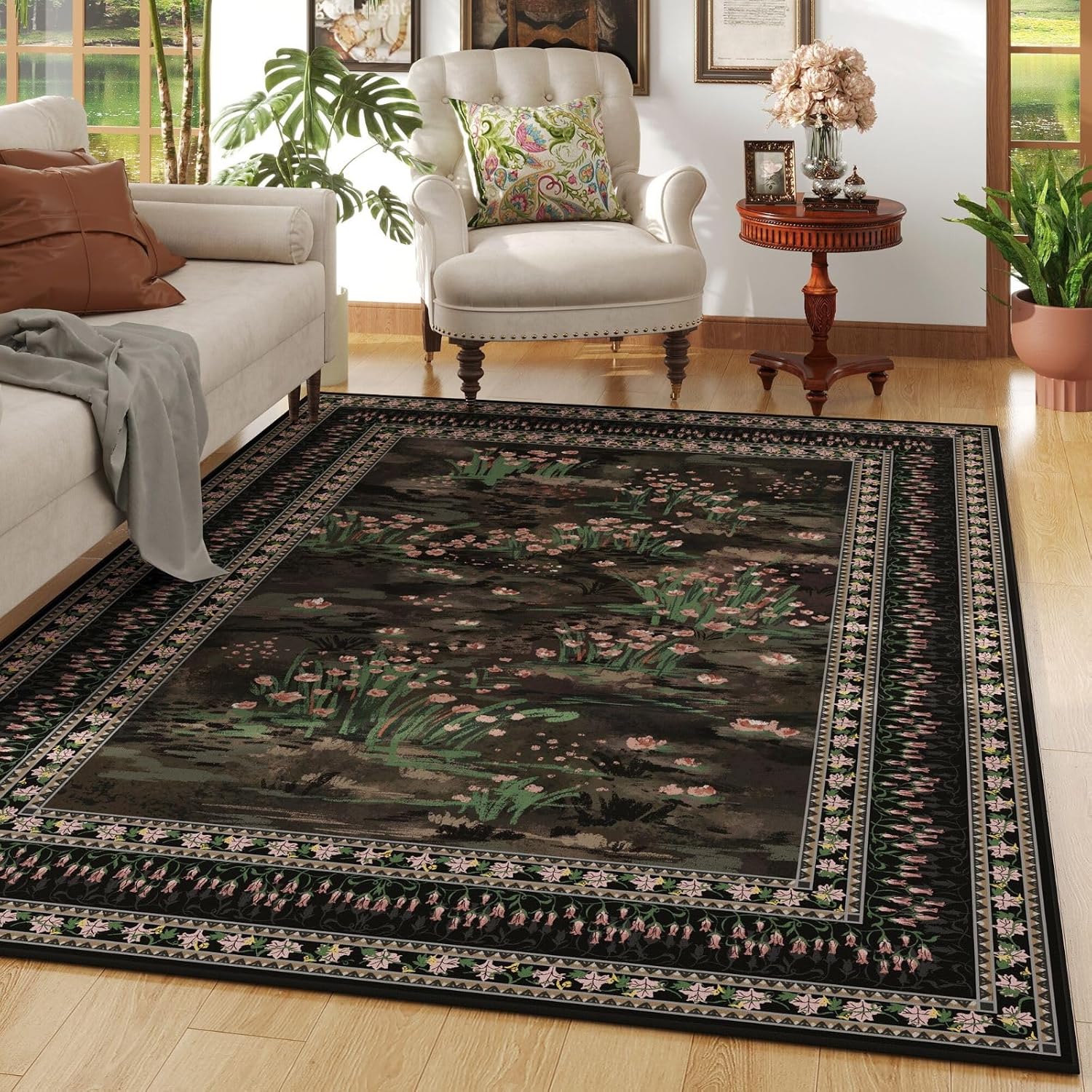 Area Rugs 8x10 Clearance Impressionist-Style Vintage Washable Area Rug Non Slip Low Pile Large Rug for Bedroom Farmhouse Dining Room Kids Playroom, Black