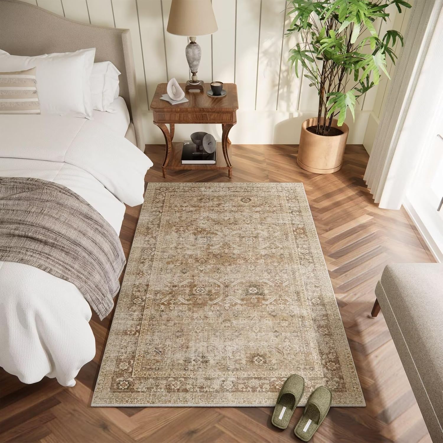Washable 4x6 Rugs for Living Room, Boho Non-Slip Silicone Backing Small Rugs for Bedroom Nursery Office, 0.3" Neutral Oriental Throw Carpet with 0.16" Cushioning Pad, Brown/Multi