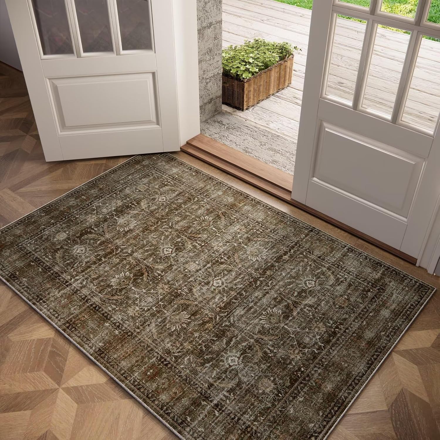 Washable 3x5 Entryway Rug Indoor, Boho Non-Slip Silicone Backing Small Rugs for Kitchen Nursery Office Bedroom, 0.3" Neutral Oriental Throw Carpet with 0.16" Cushioning Pad, Deep Brown/Multi